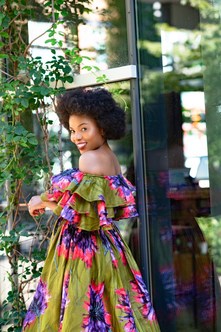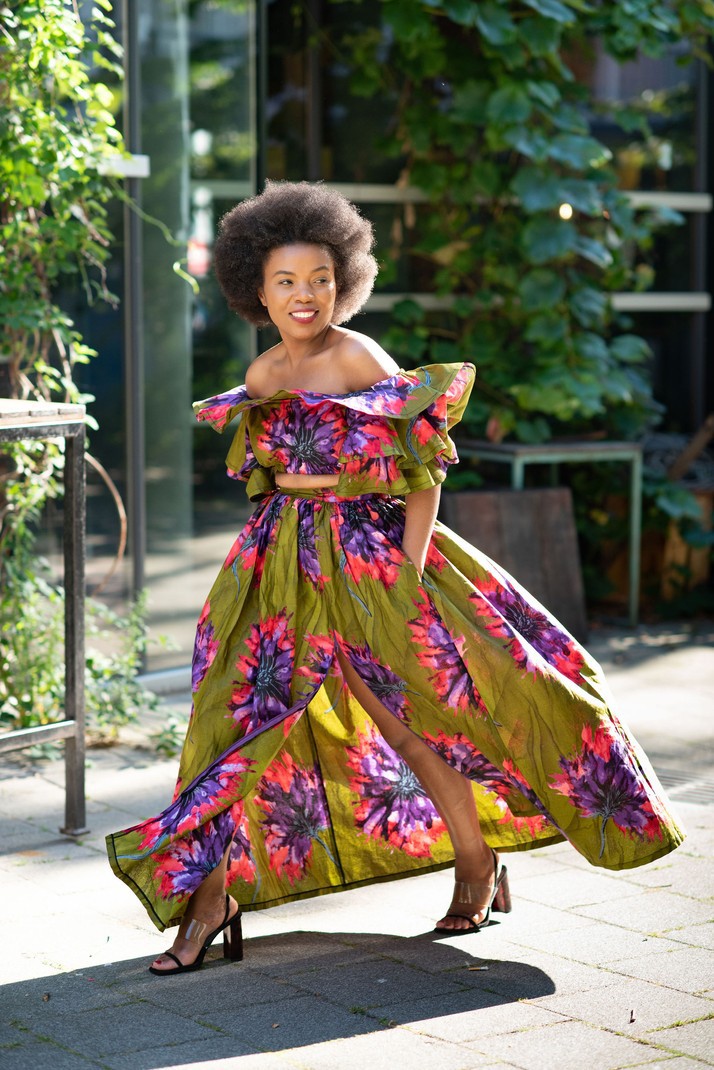 Ever wanted to be in control of how much legs you show, well you have it. This front slit invisible zip maxi skirt helps you control how much slit you want at any particular time. When it Is warm and you need some air, just pull it up. When it is cold and need some warmth, simply pull it back down. It is also a unique color of African wax print. Pair it with its top (Moremi green cropped top) look like a queen.