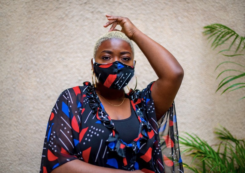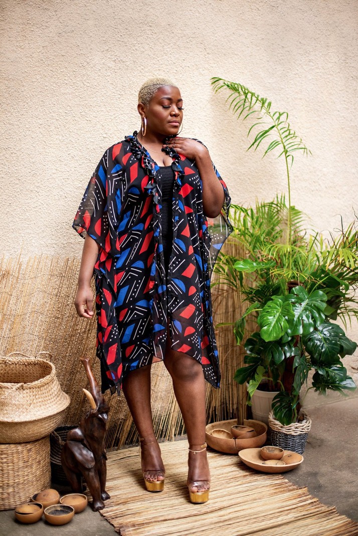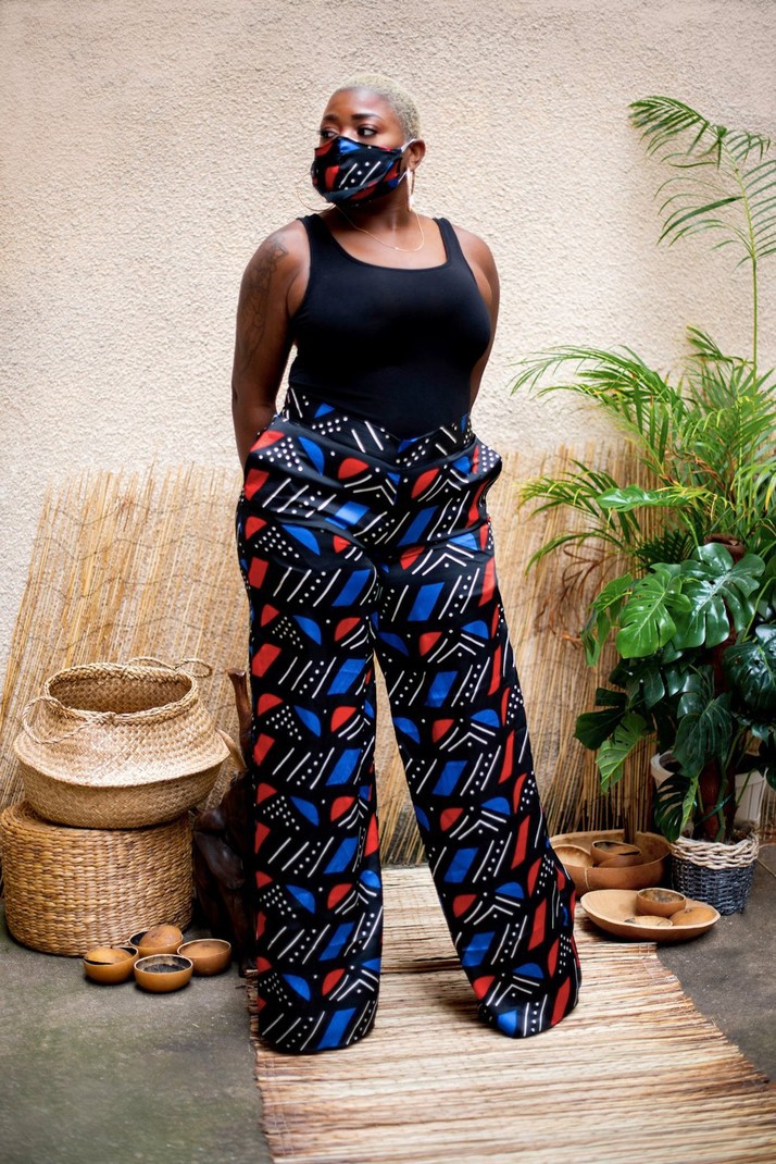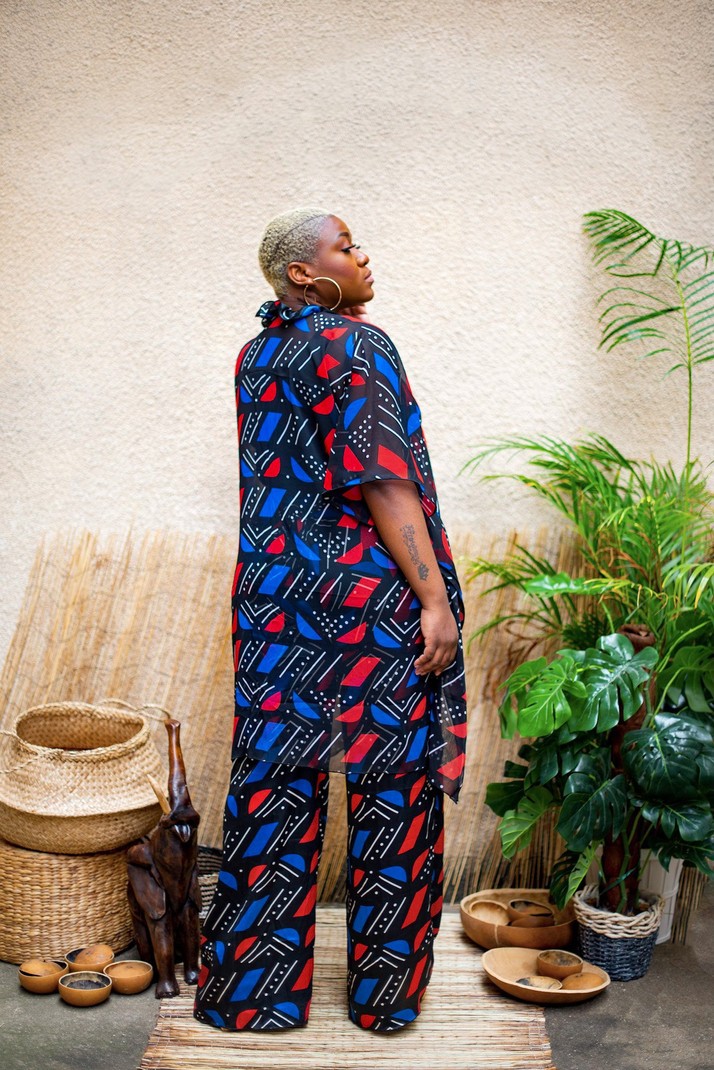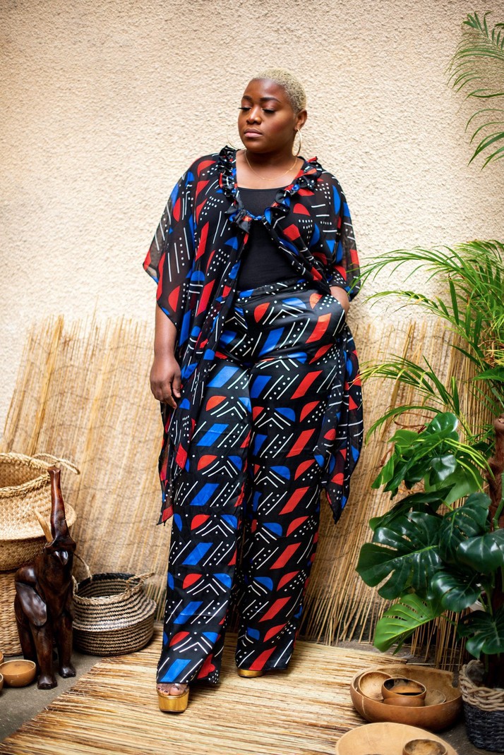 Signed by the Maison Laure Art, two-piece set with tunic and wide black, red and blue pants accompanied by its protective mask. A silk fabric for the pants and the mask and for the tunic in transparent veil. The pants have an elastic at the back as well as side pockets. The tunic is in transparent veil with ruffles at the collar and can be worn open or closed with a button. Tunic: 91 cm long Pants: 119 cm long Silk and transparent veil 7 colors available OUR MANUFACTURING: Our Franco-Beninese handmade ensemble collection is an artisanal, authentic and traditional manufacture, entirely handmade in workshops integration, by passionate women.