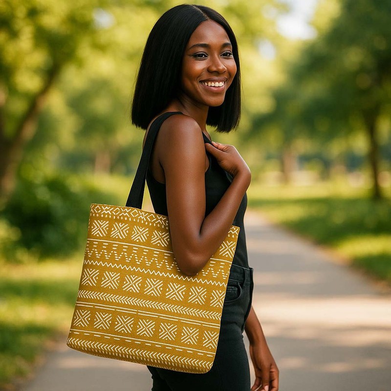 Conquer the world with our Mud Cloth African American Totes! Featuring a bold minimalist gold print, these totes offer both style and functionality with their large capacity. Embrace your adventurous spirit and stand out with this unique accessory. Product Description • 510 g/m2. Made from high-grade canvas. • Durable and roomy enough for your daily items. • Lightweight canvas tote bag with sturdy handle is easy to carry. • Perfect for shopping and carrying your essentials. Delivery Time This item will be processed within 3-7 business days (Excluding Weekends and Holidays). Once products ships it can take up to 15 Business days depending on your location. Out of Stock items can be requested by emailing us at [email protected] Care Instructions Machine wash cold inside out. Gentle cycle with mild detergent and like colors. Do not use bleach or fabric softener. Do not tumble dry. Hang to dry to ensure maximum shelf life. Iron inside out if necessary. Do not iron the print. Do not dry clean.