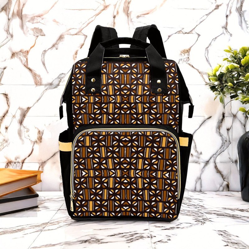 Take on any adventure with our Mud Cloth Buntu African Backpack! The perfect blend of fashion and function, this backpack can be used as a stylish accessory or a reliable diaper bag. With its bold tribal print, it's sure to turn heads while providing ample space for all your essentials. Product Description * Made from high-grade nylon, lightweight yet sturdy. * Wide open design, large interior with 1 zippered pocket and 4 elastic pockets. * One front section with 3 elastic pockets and 1 net pocket for milk bottles and other items. * Padded back panel and adjustable shoulder straps for ultra comfort and stability. * Unisex design makes the diaper bag a nice choice for both mom and dad. Delivery Time This item will be processed within 3-7 business days (Excluding Weekends and Holidays). Once products ships it can take up to 15 Business days depending on your location. Out of Stock items can be requested by emailing us at [email protected] Care Instructions Machine wash cold inside out. Gentle cycle with mild detergent and like colors. Do not use bleach or fabric softener. Do not tumble dry. Hang to dry to ensure maximum shelf life. Iron inside out if necessary. Do not iron the print. Do not dry clean.