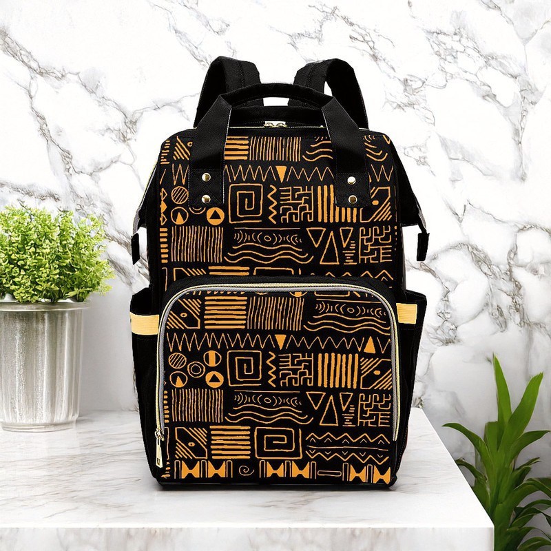 Embrace your adventurous side with our Mud Cloth Gold African Backpack. Perfect for both fashion and function, this Afrocentric backpack doubles as a stylish diaper bag for busy moms on the go. Stand out from the crowd with this unique and versatile accessory. Product Description * Made from high-grade nylon, lightweight yet sturdy. * Wide open design, large interior with 1 zippered pocket and 4 elastic pockets. * One front section with 3 elastic pockets and 1 net pocket for milk bottles and other items. * Padded back panel and adjustable shoulder straps for ultra comfort and stability. * Unisex design makes the diaper bag a nice choice for both mom and dad. Delivery Time This item will be processed within 3-7 business days (Excluding Weekends and Holidays). Once products ships it can take up to 15 Business days depending on your location. Out of Stock items can be requested by emailing us at [email protected] Care Instructions Machine wash cold inside out. Gentle cycle with mild detergent and like colors. Do not use bleach or fabric softener. Do not tumble dry. Hang to dry to ensure maximum shelf life. Iron inside out if necessary. Do not iron the print. Do not dry clean.