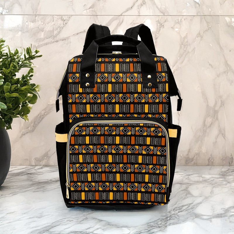Unleash your adventurous spirit with our Mud Cloth Traditional Ethnic Backpack. Made from authentic African Mud Cloth, this backpack combines style and function. Perfect for travel or everyday use, it's a bold choice for the risk-taking fashionista! Product Description * Made from high-grade nylon, lightweight yet sturdy. * Wide open design, large interior with 1 zippered pocket and 4 elastic pockets. * One front section with 3 elastic pockets and 1 net pocket for milk bottles and other items. * Padded back panel and adjustable shoulder straps for ultra comfort and stability. * Unisex design makes the diaper bag a nice choice for both mom and dad. Delivery Time This item will be processed within 3-7 business days (Excluding Weekends and Holidays). Once products ships it can take up to 15 Business days depending on your location. Out of Stock items can be requested by emailing us at [email protected] Care Instructions Machine wash cold inside out. Gentle cycle with mild detergent and like colors. Do not use bleach or fabric softener. Do not tumble dry. Hang to dry to ensure maximum shelf life. Iron inside out if necessary. Do not iron the print. Do not dry clean.