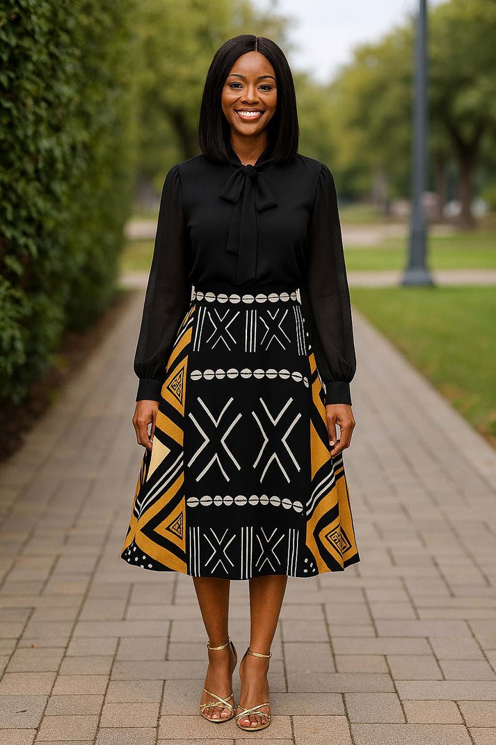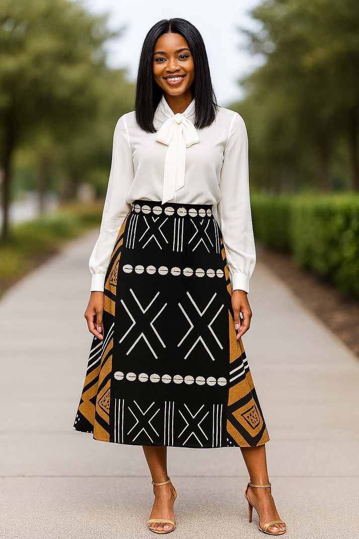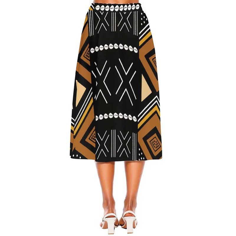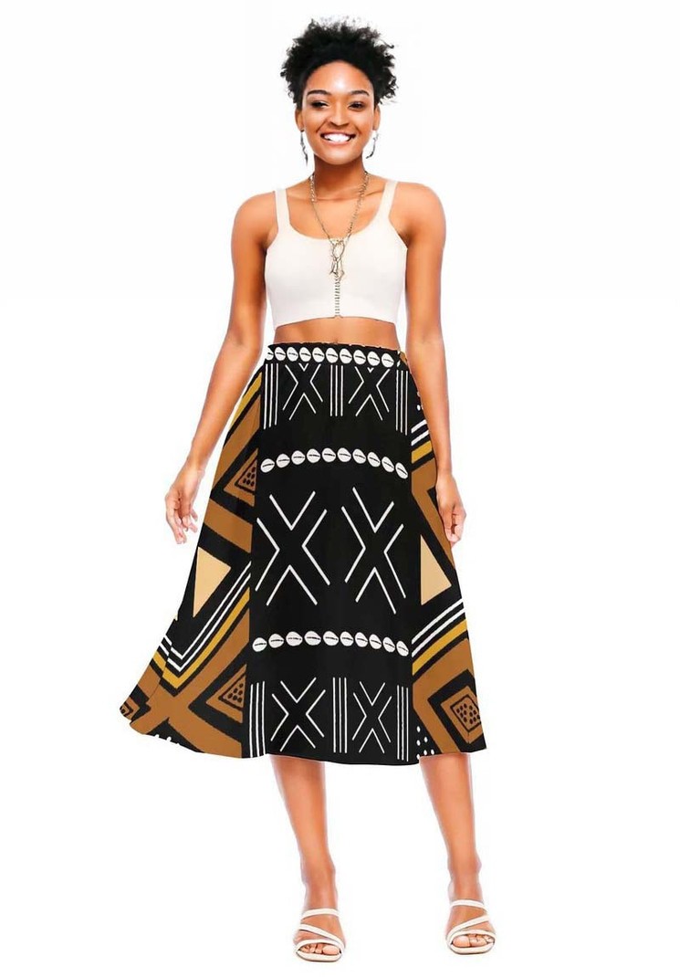 Unleash your adventurous side with our Mudcloth African Print Midi Skirt! Designed with a bold flare style, it's perfect for making a statement wherever you go. The unique mudcloth print adds an exotic touch that's sure to turn heads. Take a risk and step out in style with this must-have skirt!