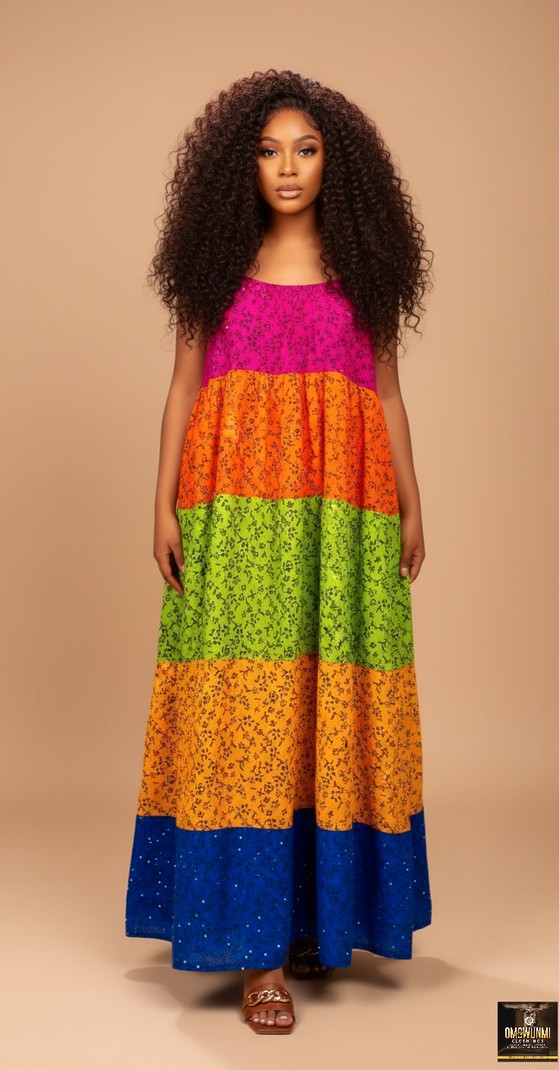 Key Features: Five-tiered, floor-length gown with bold color-blocking.