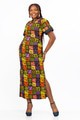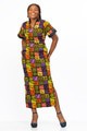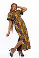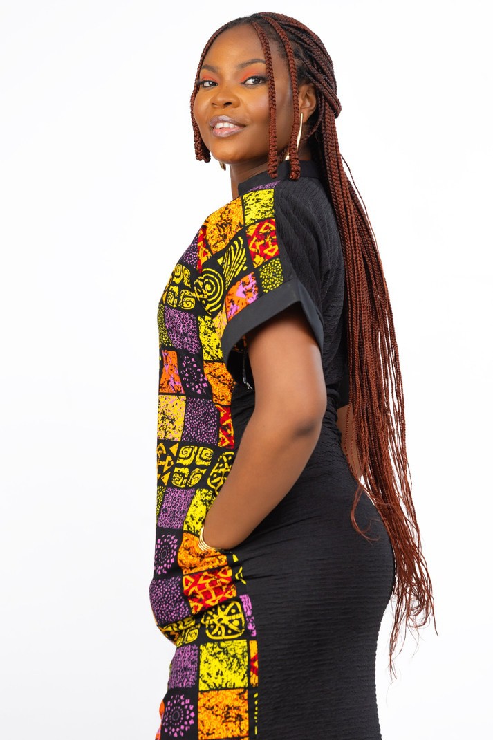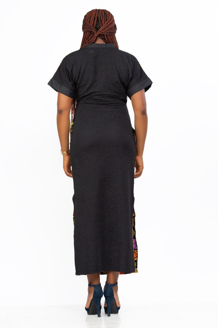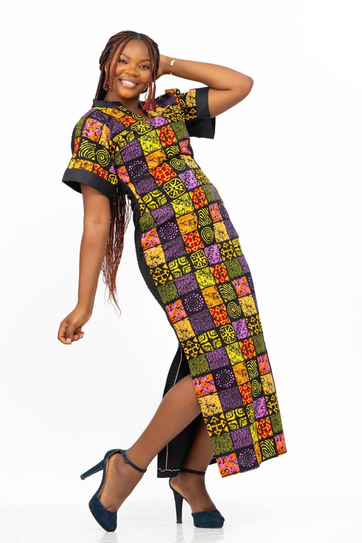 This long maxi dress combines many fun and bright colours to create a unique and stylish look. We call this print tiles because of the colours and design. The front material is comfortable cotton African print fabric . The bright colour of the dress is both vibrant and versatile, making it a great choice for a range of occasions. The back fabric is a solid black crinkle stretch fabric to give you the perfect 'Rich Auntie' look. This African maxi dress silhouette is flattering and easy to wear, making it a go-to option for any fashion-forward wardrobe. The batwing sleeves also add a fun feel to the dress.