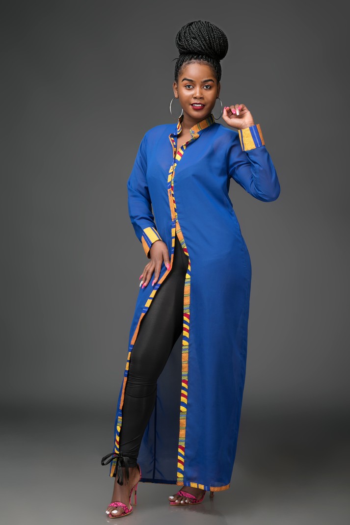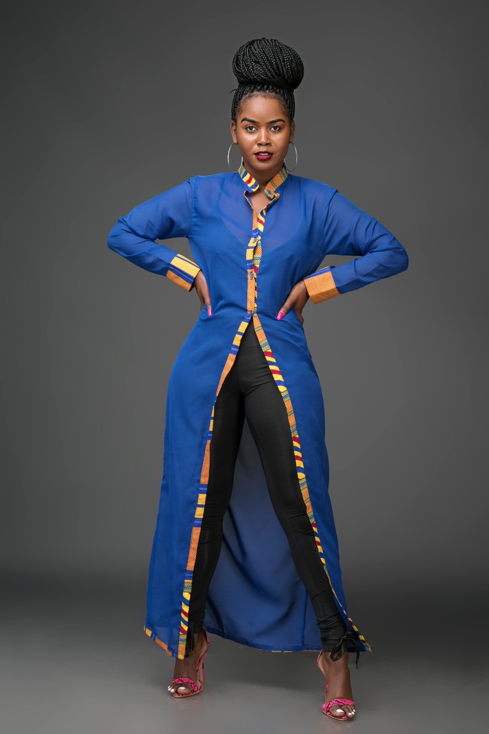 Our MUTHE Kimono comes from beautiful blue chiffon that is bound by a bright Ankara, this light kinono is perfect for summer / spring and can be rocked in multiple ways.Rock as a kimono or as a beach cover-up