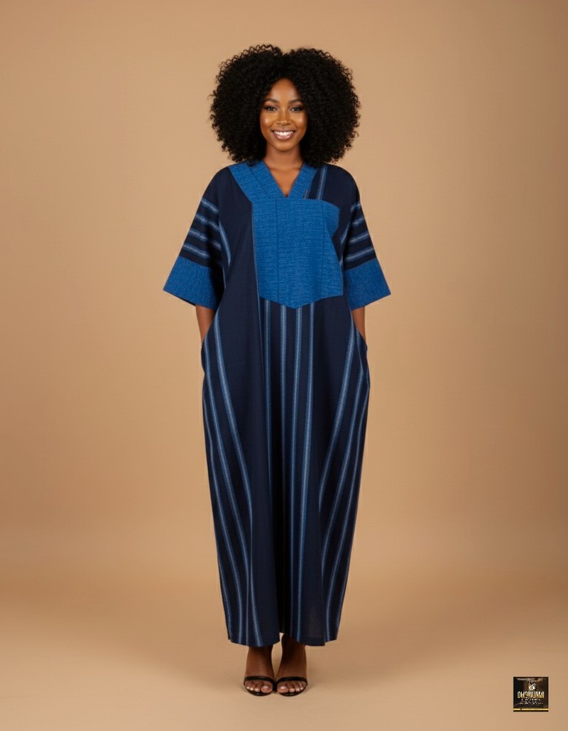 Embrace timeless elegance with this effortlessly chic navy blue kaftan dress. Crafted from premium woven fabric, it features subtle vertical stripes that elongate the silhouette while offering a flattering and graceful flow. The wide V-neckline and short kimono-style sleeves add a touch of relaxed sophistication, complemented by a front patch detail for modern flair.
