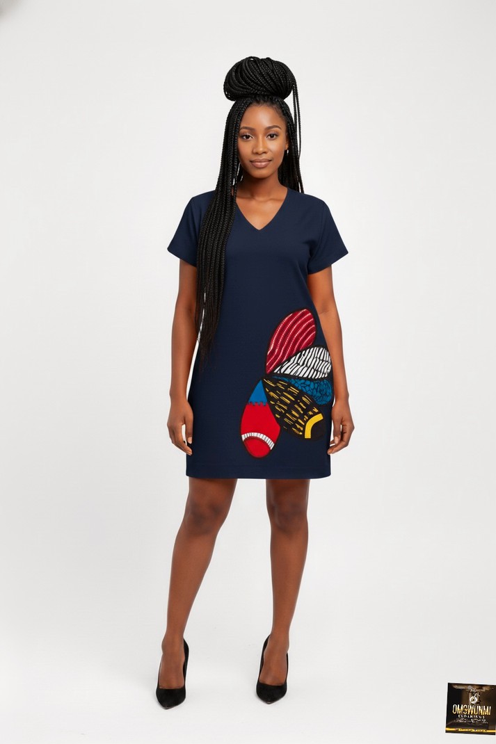 Effortlessly chic, this Navy Blue Mini Dress combines simplicity with artistic flair. Crafted from soft, breathable fabric, it features a V-neckline and vibrant Ankara patchwork detailing on the lower side, adding a pop of color and personality. Its minimal yet stylish design makes it ideal for casual outings, brunches, or weekend wear, offering both comfort and elegance.