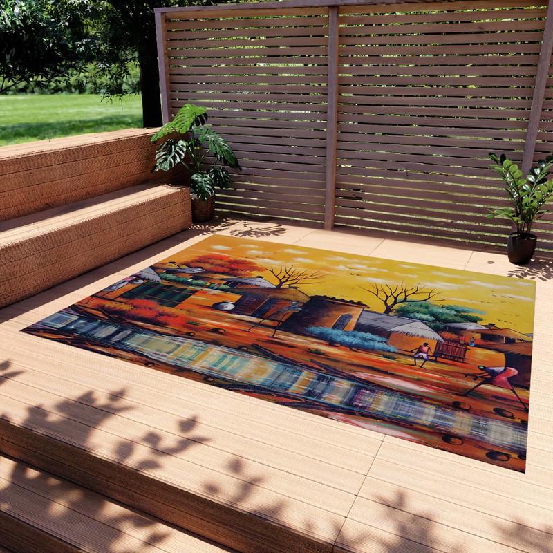 Transform your outdoor space into an African adventure with our Nigerian Colorful Outdoor Rugs. Featuring a vibrant village painting, these rugs add a touch of boldness and take your decor to the next level. Bring the spirit of Africa to your doorstep and take a risk with these unique and striking rugs.