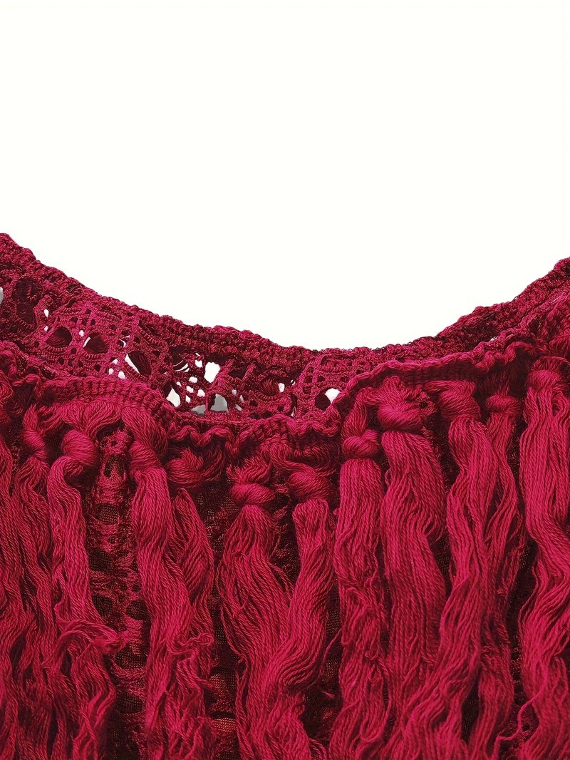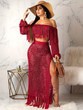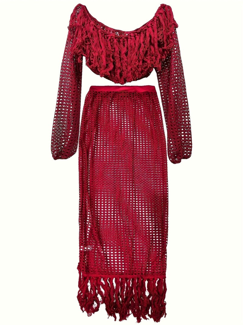 Off-Shoulder Fringe Two-Piece Skirt Suit, Casual Polyester Spandex Knit, Solid Color, Sheer Mesh Grid Pattern, Long Sleeve Crop Top with Matching Skirt, Elegant Spring/Fall Outfit