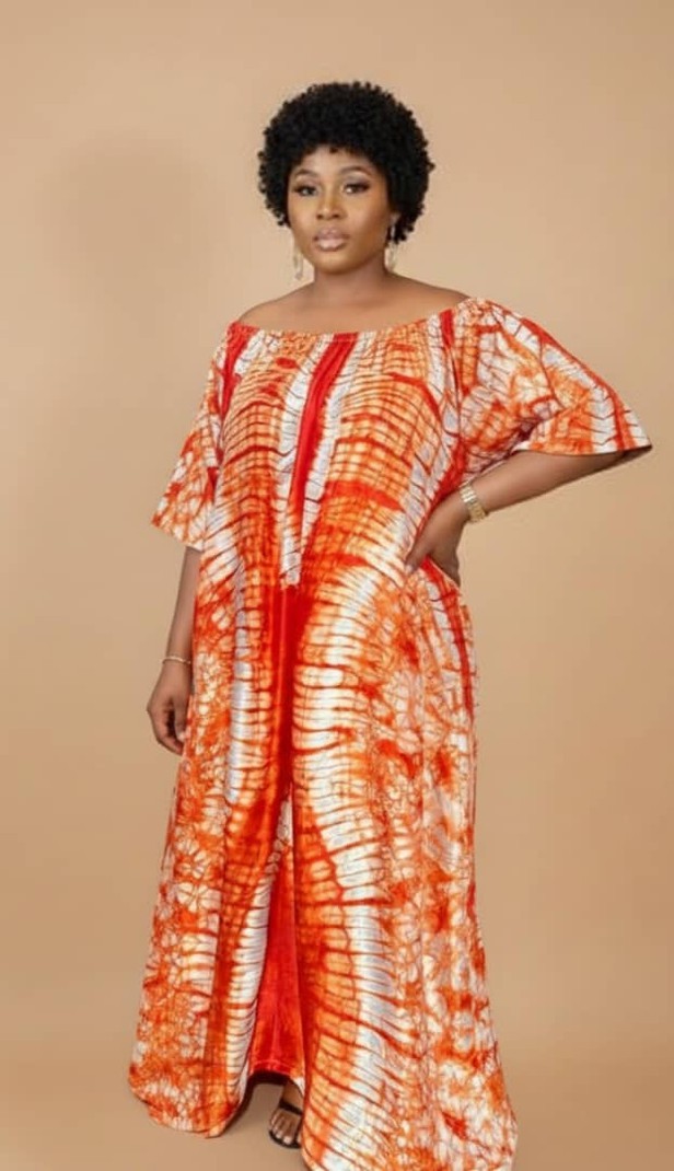 This elegant off-the-shoulder maxi dress is a vibrant celebration of contemporary African style, meticulously crafted from premium Adire cotton known for its luxurious sheen and fluid drape. The garment features a striking orange and white tie-dye pattern with a vertical red accent panel that elongates the silhouette, offering a rich texture that feels as beautiful as it looks. Designed with a relaxed, flowy fit and comfortable mid-length sleeves, this dress transitions effortlessly from sophisticated daytime events like garden weddings and upscale brunches to more formal evening gatherings. To complete the look, pair this stunning piece with a gold chain wristwatch and simple sandals, allowing the bold patterns of the silk to remain the focal point.
