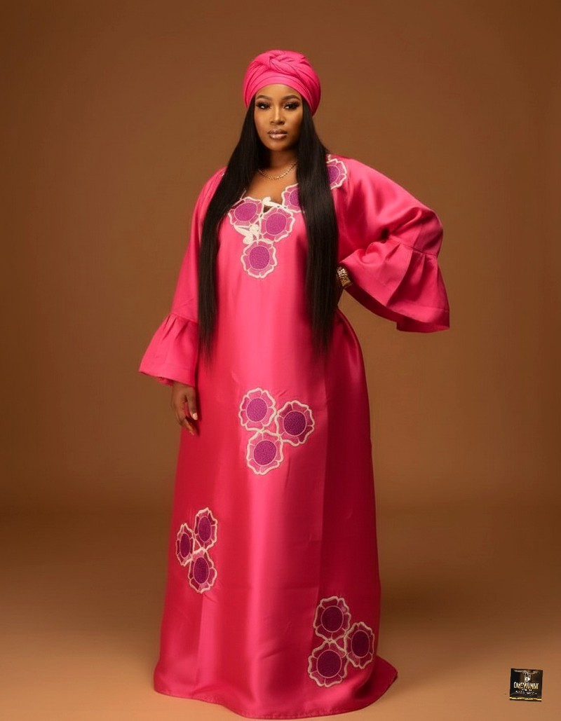 This vibrant, floor-length kaftan is crafted from a rich, fuchsia pink, subtly lustrous satin fabric that drapes beautifully in a generous, flowing silhouette. The garment features wide, full-length sleeves that terminate in a decorative tiered ruffle detail, adding a feminine touch and movement to the arms. A key design element is the scattered placement of large, stylized floral embroidery across the bodice and lower skirt; these embroidery feature a pink center with intricate white or light light pink embroidered details, all outlined by a thick white border, creating a striking contrast against the rich background color. The neckline is a simple scoop, adorned with a continuous line of these floral designs, and the look is completed with a coordinating fuchsia pink fabric headwrap. This opulent yet comfortable kaftan is ideally suited for special cultural occasions, elegant evening celebrations, significant family milestones, or religious holidays, appealing to customers seeking bold color and sophisticated, traditional-inspired attire.