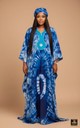 This elegant maxi kaftan beautifully showcases a unique blend of vibrant blue hues and white tones, achieved through a captivating tie-dye/ batik technique, resulting in a mesmerizing, free-flowing abstract pattern across the entire garment. The luxurious, wide-cut silhouette features a generous floor length and gracefully flowing batwing sleeves, offering an air of comfort, modesty, and sophistication suitable for various occasions. A notable feature is the embellished V-neckline, which is detailed with a circular, textural embroidered in a coordinating solid blue fabric, adding an exquisite, handcrafted element that draws attention to the décolletage and elevates the overall design. The loose, flattering drape of the fabric makes this a truly versatile and statement-making piece, combining traditional textile artistry with modern relaxed elegance.