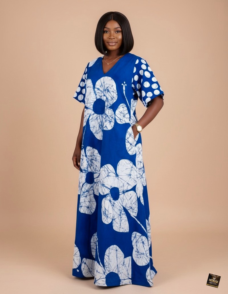 This vibrant floor-length kaftan is a stunning example of contemporary African luxury, featuring a bold royal blue base adorned with oversized, white batik-style floral motifs and playful polka-dot patterns on the sleeves. Expertly crafted from premium, high-quality polished cotton, the fabric provides a smooth, breathable texture and a structured drape that ensures a regal and effortless silhouette. The design is characterized by a flattering V-neckline, relaxed short sleeves, and practical side pockets. This majestic piece is an ideal choice for a variety of upscale occasions, including high-profile cultural festivals, elegant garden parties, or as a distinguished statement gown for formal holiday gatherings where you want to radiate grace and artistic pride.