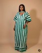 This elegant floor-length kaftan features a striking, artisanal-inspired design with broad vertical stripes in a refreshing emerald green and crisp white palette. Meticulously crafted from a high-quality, breathable batik fabric, the garment offers a structured yet airy drape that ensures maximum comfort and a regal, flowing silhouette. The design is characterized by a sophisticated V-neckline with a unique horizontal band detail across the collarbone and relaxed short sleeves. This versatile statement piece is an ideal choice for a variety of upscale occasions, including high-end tropical resort dinners, elegant garden parties, or sophisticated cultural celebrations where you want to project effortless grace and contemporary style.