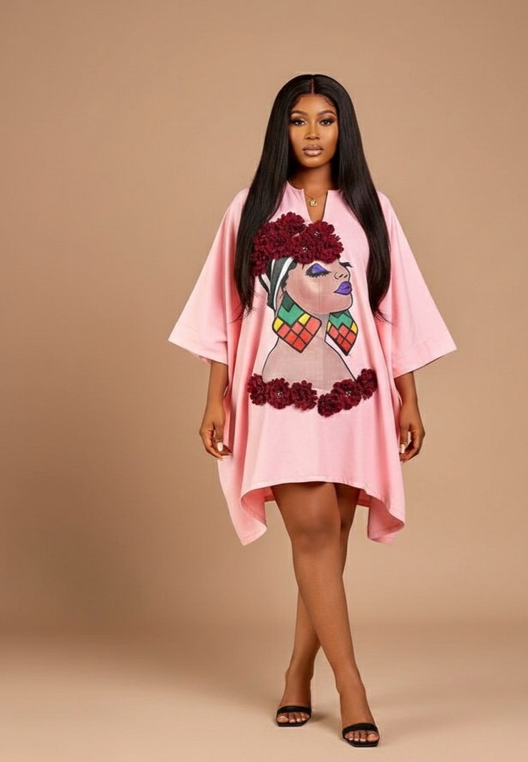 This playful and vibrant mini-dress is a true statement piece, offering a unique blend of graphic artistry and textural embellishment. Crafted from a soft crepe fabric, the dress is rendered in a delightful pastel bubblegum pink hue that beautifully complements the bold central artwork. It features a relaxed, oversized kaftan-style silhouette with a dramatic high-low hemline, which offers a flattering leg-lengthening effect, and a simple V-neck opening. The dress is dominated by a powerful, colorful graphic print of an African woman's face, richly adorned with a headwrap and chunky geometric earrings. What sets this piece apart are the deep maroon/burgundy floral appliqués, likely made of felt or fabric, that frame the graphic at the bust and skirt level, adding an exquisite 3D texture and depth to the design. This distinctive dress is perfect for standing out at summer parties, music festivals, weekend trips, birthday celebrations, or any fun outing where bold, artistic style is desired.