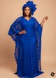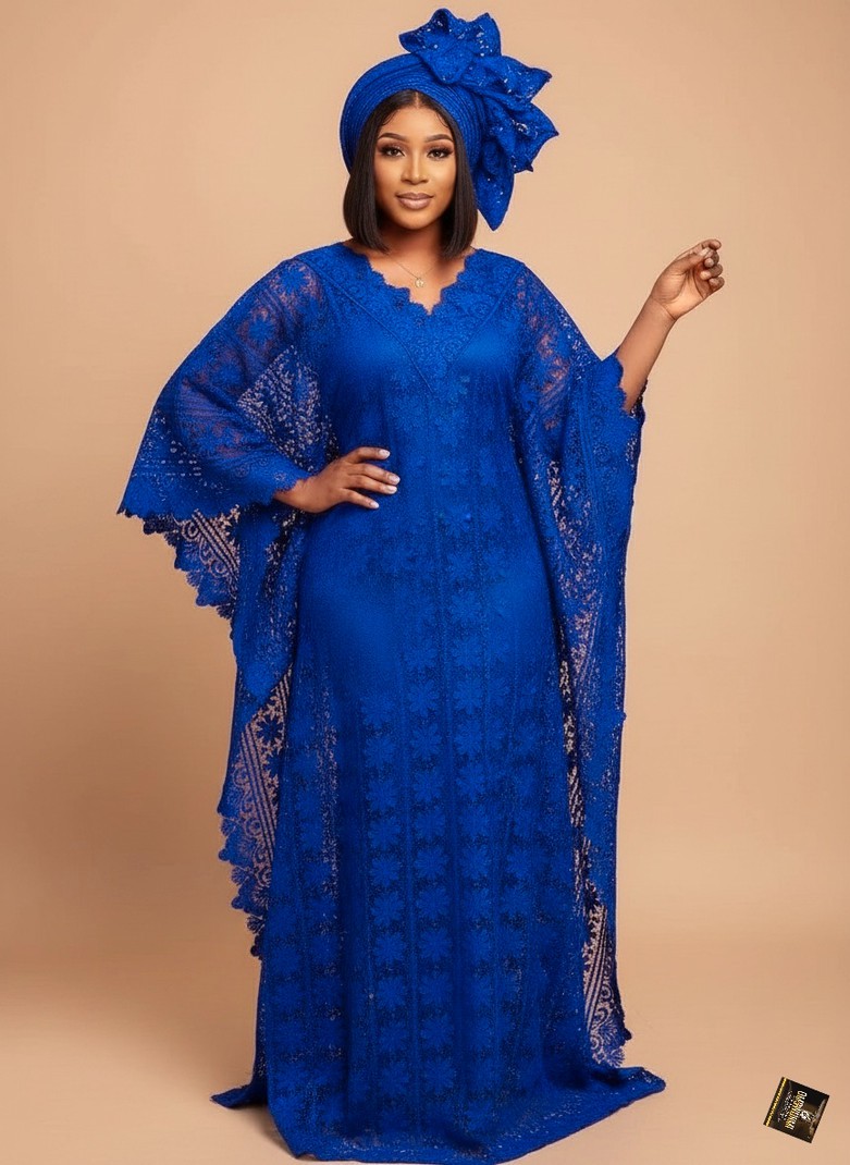 This breathtaking floor-length gown is a true masterpiece of craftsmanship, meticulously created from luxurious electric blue cord lace that features intricate floral embroidery and delicate scalloped edging along the V-neckline and hem. The silhouette is designed in a traditional yet contemporary boubou style, offering a regal and airy fit with expansive, sheer butterfly sleeves that showcase the lace's stunning transparency. To further elevate the opulence of the look, it is styled with a matching avant-garde lace headwrap and a sophisticated gold chain wristwatch, ensuring a cohesive and high-fashion finish. This majestic garment is the ultimate choice for high-profile weddings, prestigious cultural galas, or festive religious celebrations, providing an unforgettable presence that radiates both grace and modern luxury.