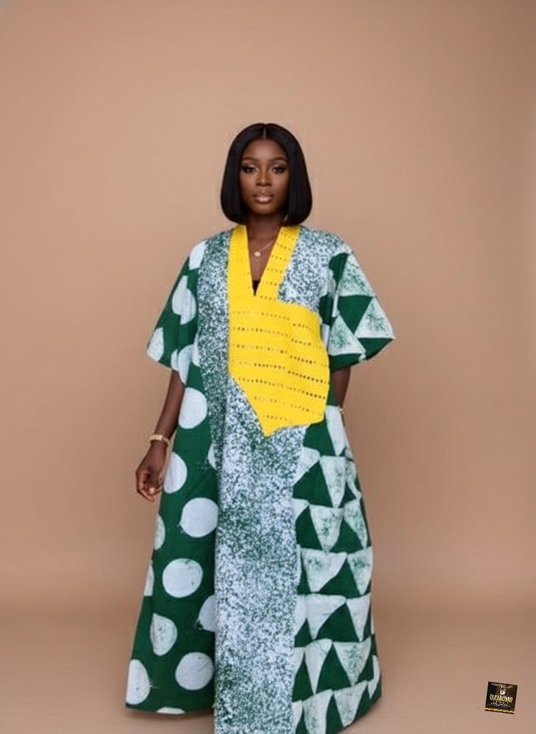This striking forest green Adire maxi dress is a captivating fusion of geometric precision and artisanal heritage, expertly tailored from high-quality, breathable hand-dyed cotton that ensures a regal and structured silhouette. The garment features an intricate patchwork of traditional motifs, seamlessly blending bold white circular patterns with sharp triangular segments, all grounded by a central vertical panel of fine, stippled texture that elongates the frame. A vibrant canary yellow bib with delicate eyelet detailing serves as a brilliant focal point, framing the neckline with a modern, sunny contrast that complements the deep green tones of the body. With its effortless A-line cut and wide, comfortable sleeves, this gown is an exceptional choice for prestigious cultural weddings, upscale garden parties, or creative professional events, offering a sophisticated look that is both deeply rooted in African textile arts and vibrantly contemporary.