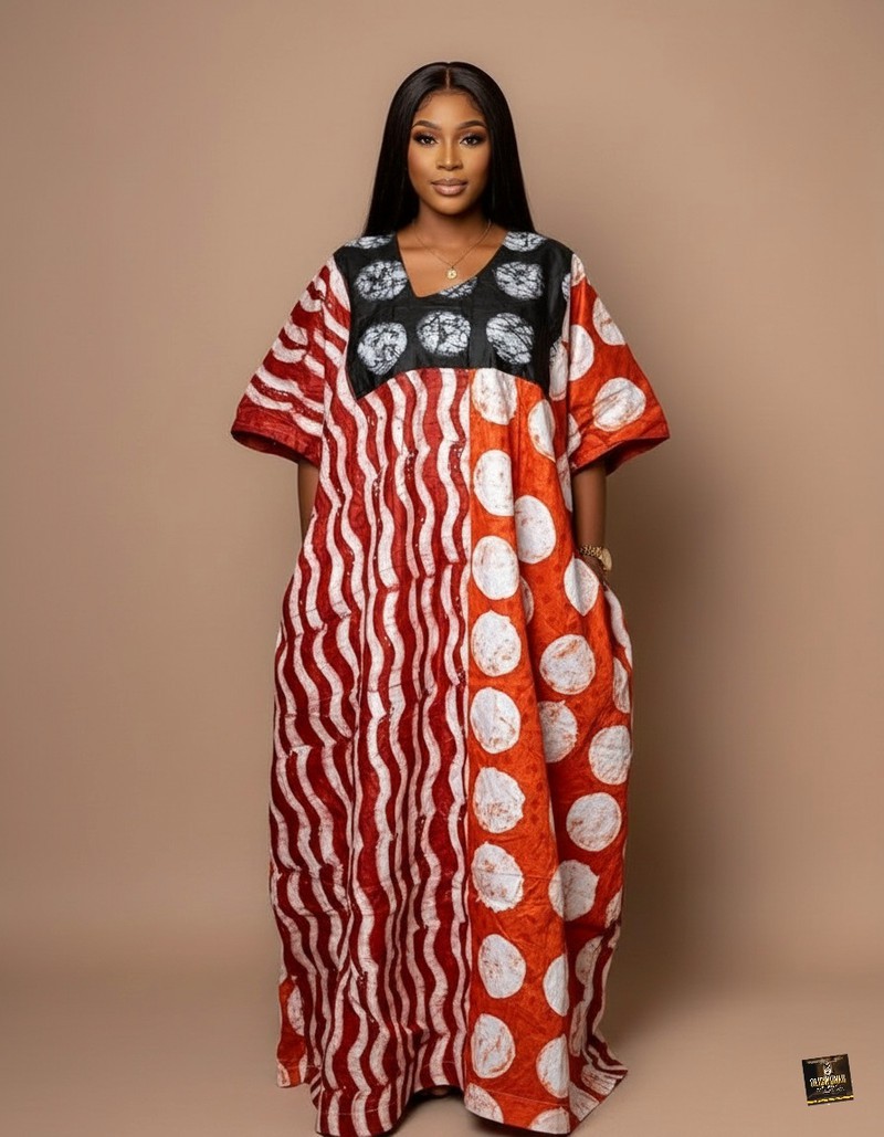 Step into bold color and design with this striking Kaftan Maxi Dress, which features a vibrant, multi-patterned design in an eye-catching palette of rich red-orange, black, and white. The voluminous, loose-fitting silhouette and generous short sleeves define the classic kaftan style, ensuring maximum comfort and flow. The print features two dominant patterns: one side showcases striking red and white vertical wavy stripes, while the other side features large white circular spots against the red-orange background. A contrasting black and white patterned yoke completes the look. Crafted from what appears to be a structured yet breathable ankara batik fabric, potentially utilizing a wax print or resist-dye technique, this dress offers both comfort and durability. This vibrant kaftan is the perfect statement piece for tropical vacations, cultural festivals, stylish outdoor gatherings, or any occasion where you want to embrace bold, contemporary prints.