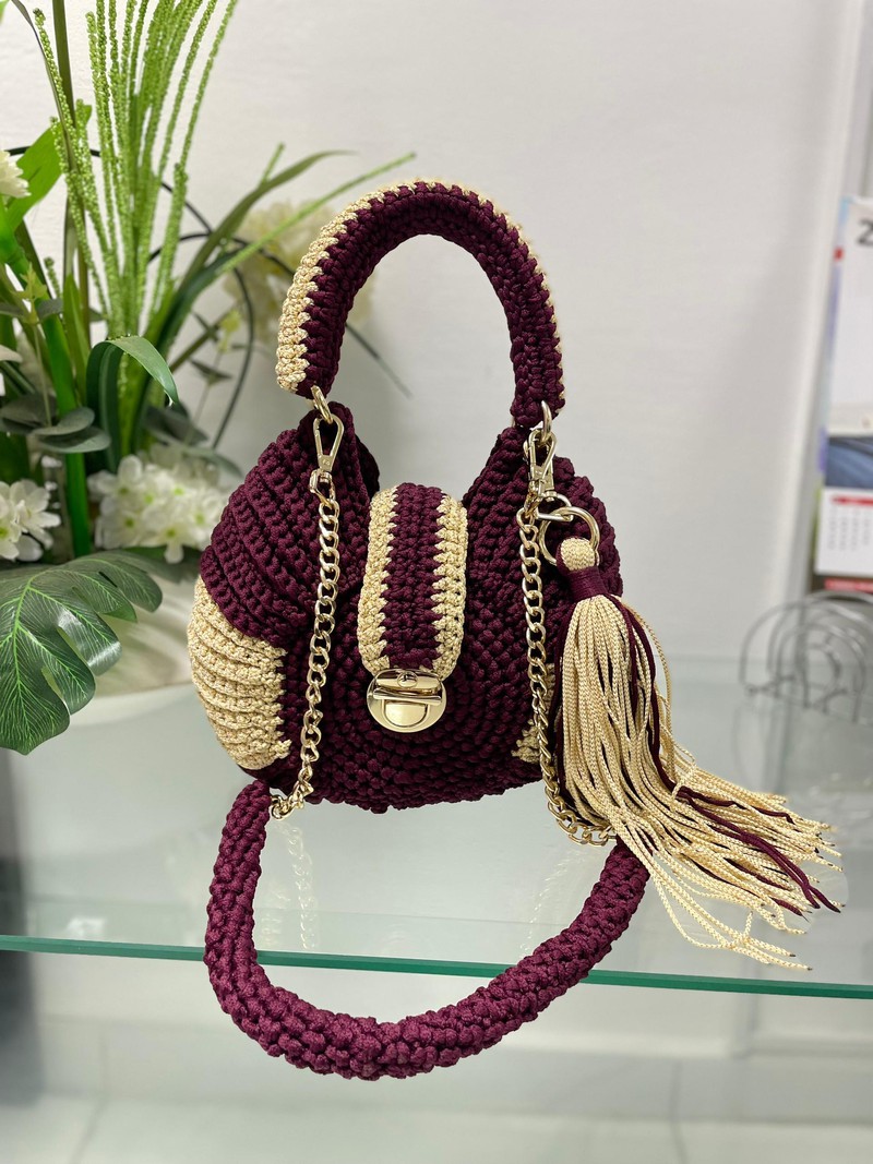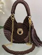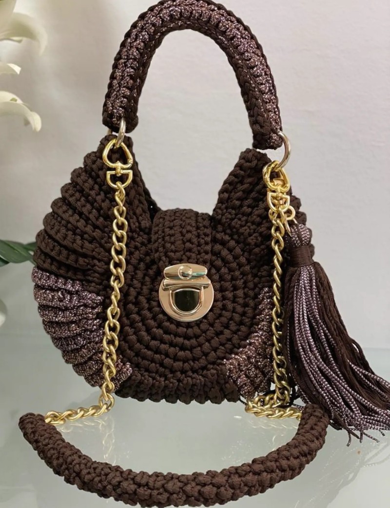 • Color & Material: It’s a dark brown bag made from a tightly woven material, which gives it a rich texture and pattern.