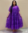 Step into a fairytale with this ethereal organza dress. The unique chartreuse-purple color glows against the skin. Designed with a overlay and an opaque inner slip, the dress features an oversized, tent-style silhouette with billowy puff sleeves and a gathered tiered hem. It is romantic, playful, and undeniably high-fashion.