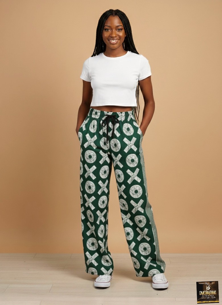 Show off your bold style with these green and white Ankara wide-leg pants. The striking X and O patterns add a unique African-inspired touch to this comfortable, high-waisted design. Perfectly paired with a simple crop top or tucked-in blouse, these trousers are ideal for casual outings, travel, or relaxed weekends—effortlessly blending tradition with modern fashion.