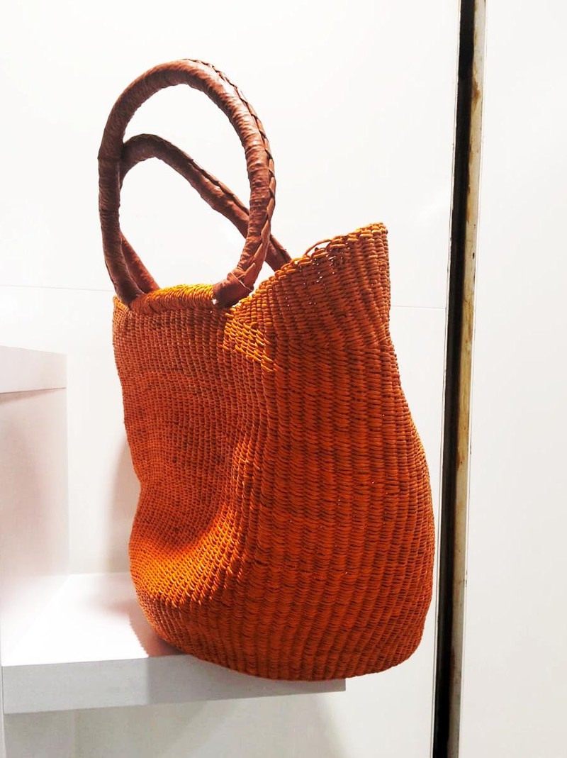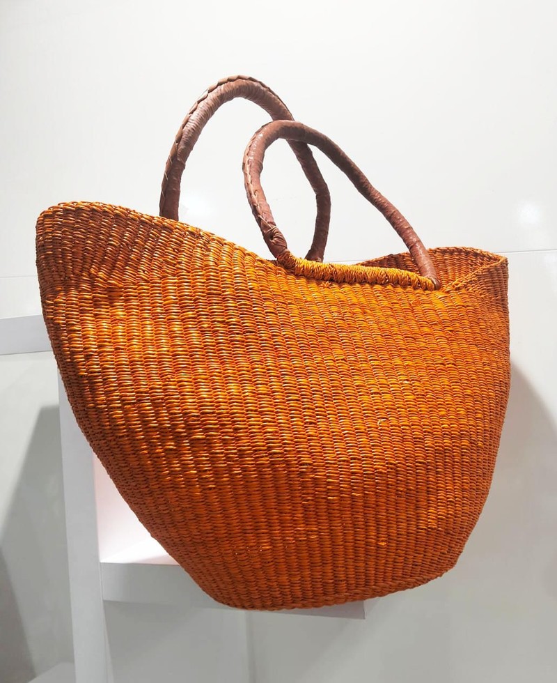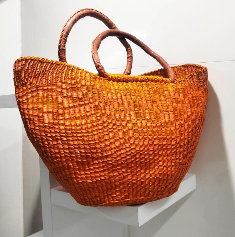 Beau panier en paille tissé avec anses en cuir fabriqué artisanalement au burkina Faso .