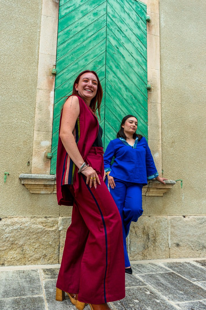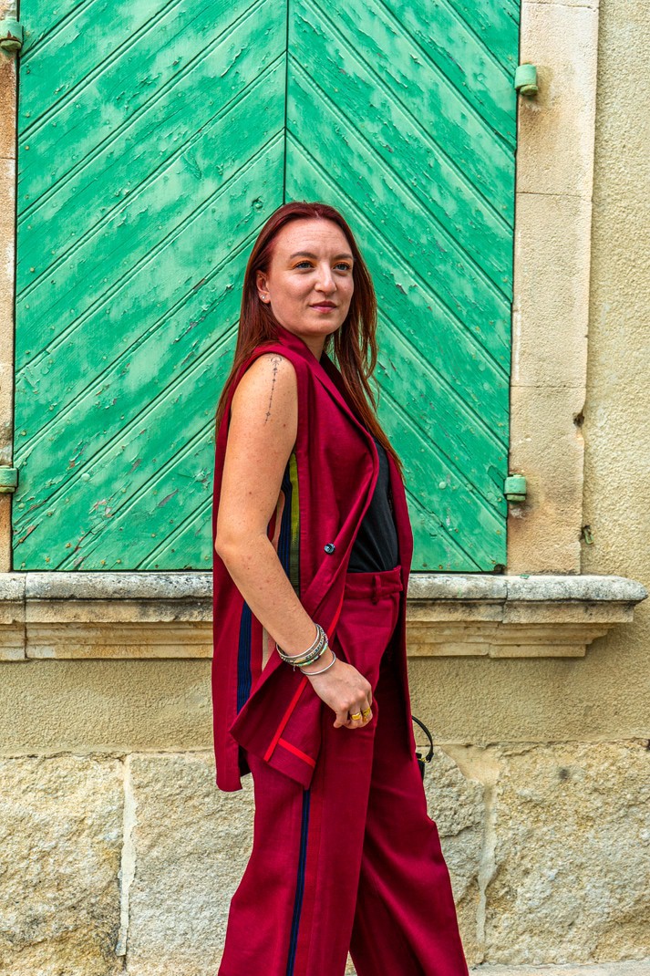 Sama : un pantalon qui vous appartient, vraiment. Inspiré du tailleur classique, mais pensé pour la liberté. Un essentiel revisité, entre raffinement et confort, à porter sans contrainte, avec allure. Cette version en rouge pourpre audacieux est soulignée par des bandes en Aso Oke nigérian, pour une allure vibrante et affirmée. Coupe large fluide, taille haute confortable. -Ceinture boutonnée à l'avant avec braguette, élastique discret au dos. -Passants pour ceinture. -Poches latérales discrètes et poche arrière passepoilée. -Bandes de tissu Aso Oke le long des jambes. -Finitions intérieures soignées. Matières & composition Lin 100 % (240 g/m²) Tailles S – M – L – XL Entretien Lavage délicat à 30 °C Repassage doux sur l'envers Confection & livraison sous 2–3 semaines Chaque pantalon est confectionné à la commande, en édition limitée, selon la disponibilité des tissus traditionnels.