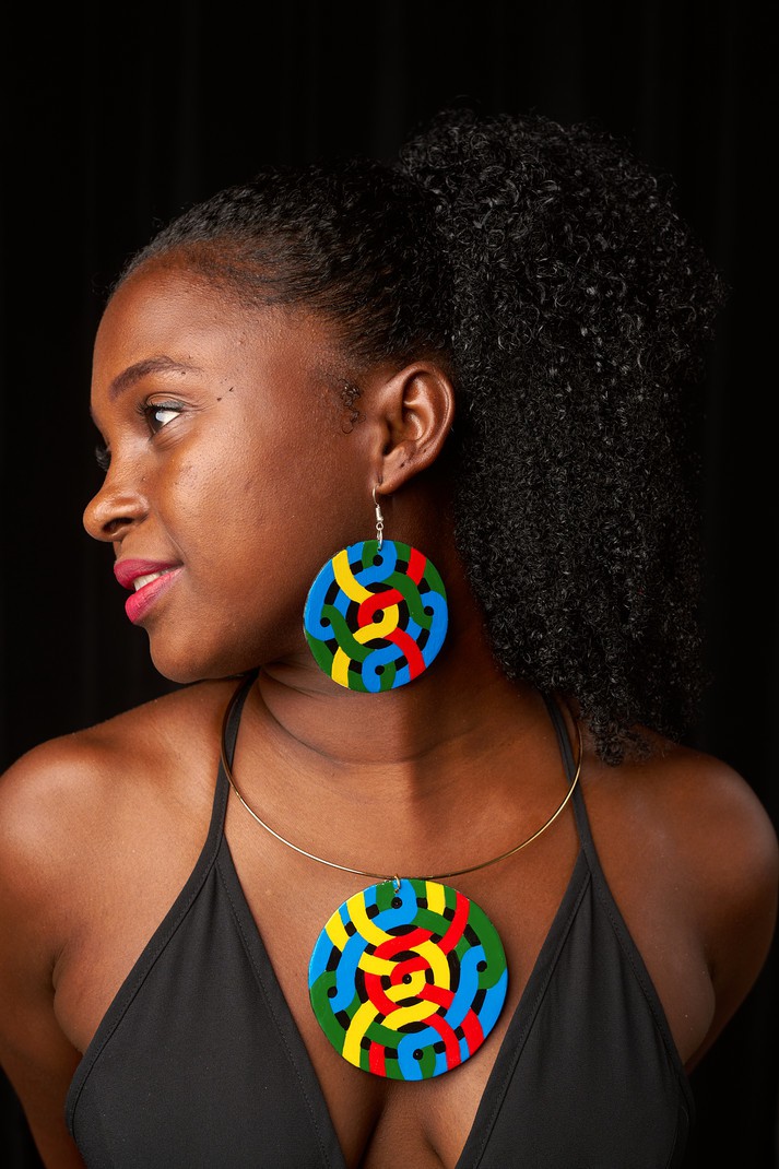 Parure en art tembé Collier,bague et boucles d'oreilles Légères et résistances Les motifs tembé ont une signification,ce sont des formes géométriques qui s'entrelacent sur des objets décorés offerts lors de grandes occasions. Lors d'un mariage traditionnel, les hommes offrent un tembé à leur épouse qui symbolise un engagement : la fidélité, la protection, l'envie de fonder une famille nombreuse, etc. Les pirogues et les pages sont également décorées pour assurer succès et richesse à ceux qui naviguent sur le fleuve. Les couleurs de l'art ont toutes une signification : Le noir pour la terre Le rouge pour l'homme et le sang Le blanc pour la femme et la beauté Le jaune pour la richesse Le vert pour la nature (forêt) Le bleu pour la mer Matériel :Bois de Guyane ATTENTION : Eviter tout contact avec l'eau. Signification : La chaîne de l'amitié