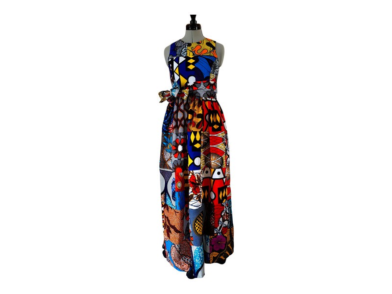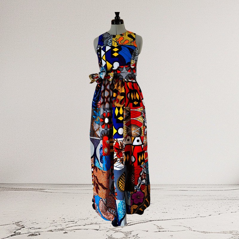Ankara patchwork dress. Zipper in the back Sleeveless Round neck. Detachable belt. All patchwork is handmade, each dress is unique. Handwash only.
