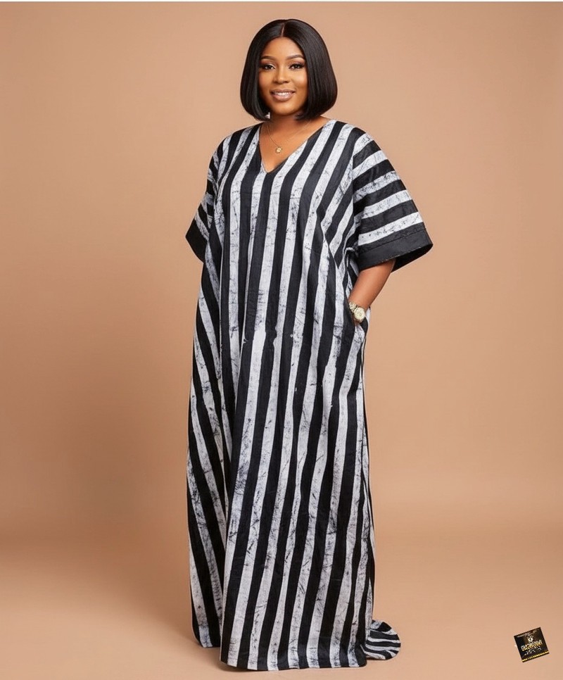 This striking floor-length kaftan features a bold, graphic aesthetic with clean vertical stripes in a timeless black and white color palette, elevated by an artisanal batik-inspired texture. Meticulously crafted from premium, high-quality polished batik, the fabric offers a smooth, breathable feel and a structured drape that maintains a regal and effortless silhouette throughout the day. The design is characterized by a sophisticated V-neckline and relaxed short sleeves. This versatile statement piece is an ideal choice for a variety of upscale occasions, including high-profile cultural festivals, elegant garden parties, or as a distinguished ensemble for a formal holiday celebration where you want to project modern grace and contemporary style.
