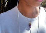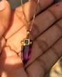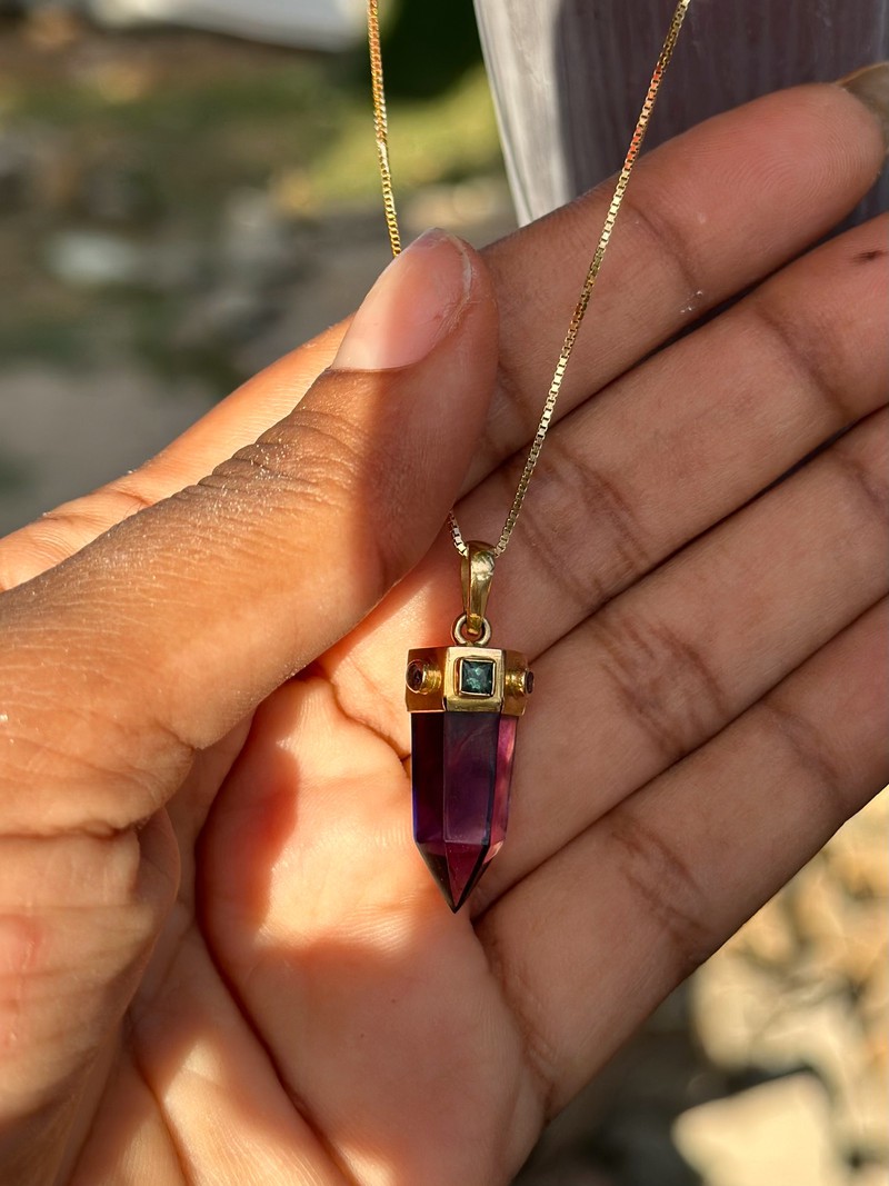 Ce pendentif raffiné marie l’élégance de l’or à la magie des pierres précieuses. En son centre, un prisme d’améthyste finement taillé capte la lumière avec des reflets violets profonds et mystérieux, symbole de sagesse et de spiritualité.