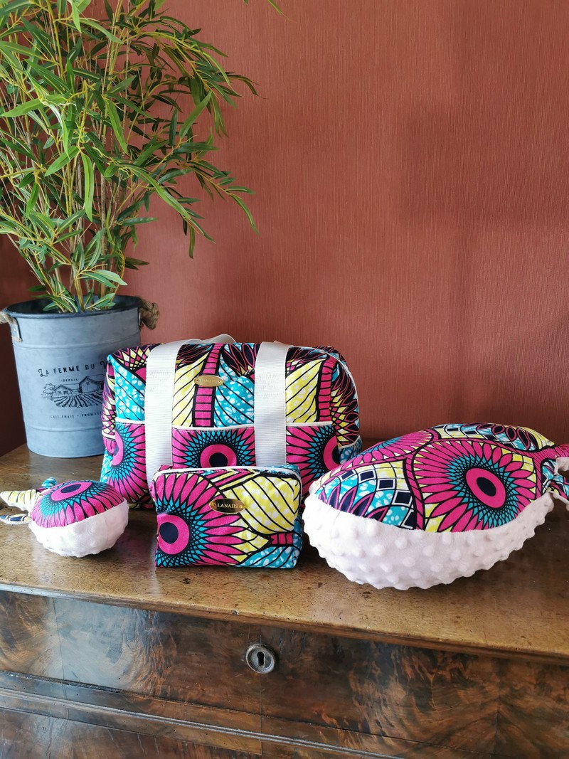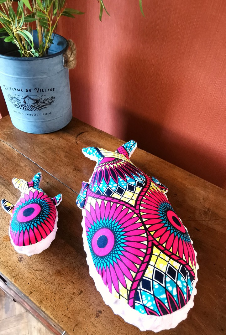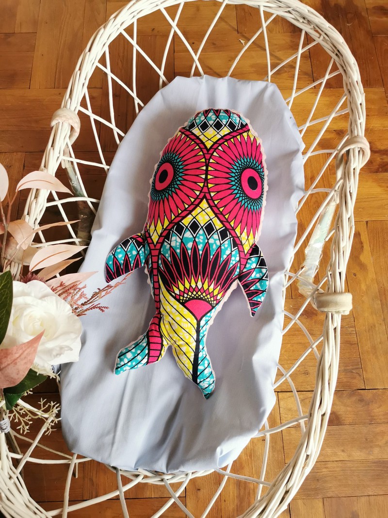 Notre baleine a été imaginée comme un vrai petit compagnon de tendresse pour les tout-petits. Cousue entièrement à la main, elle allie tissu wax coloré et matière ultra-douce minky, pour éveiller bébé au toucher, aux formes, et à sa culture.