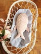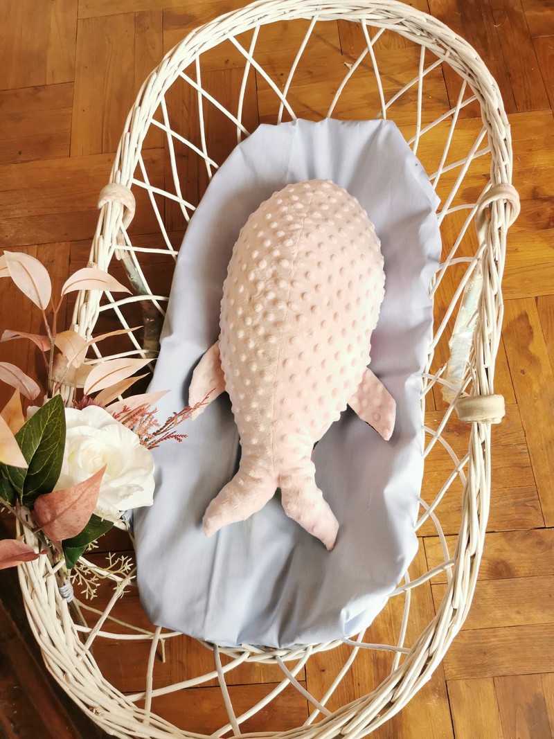 Il existe en deux tailles: une grande baleine pour conforter bébé à la maison et un petit baleineau à emporter dans son sac à langer pour le réconforter en balade hors de la maison.