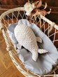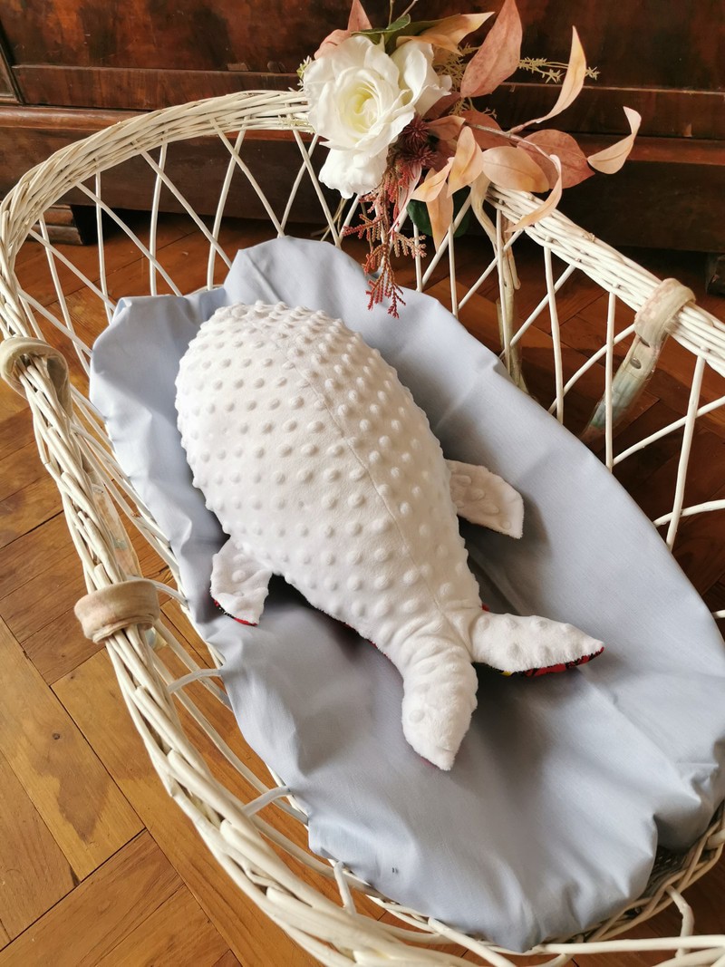 Il existe en deux tailles: une grande baleine pour conforter bébé à la maison et un petit baleineau à emporter dans son sac à langer pour le réconforter en balade hors de la maison.