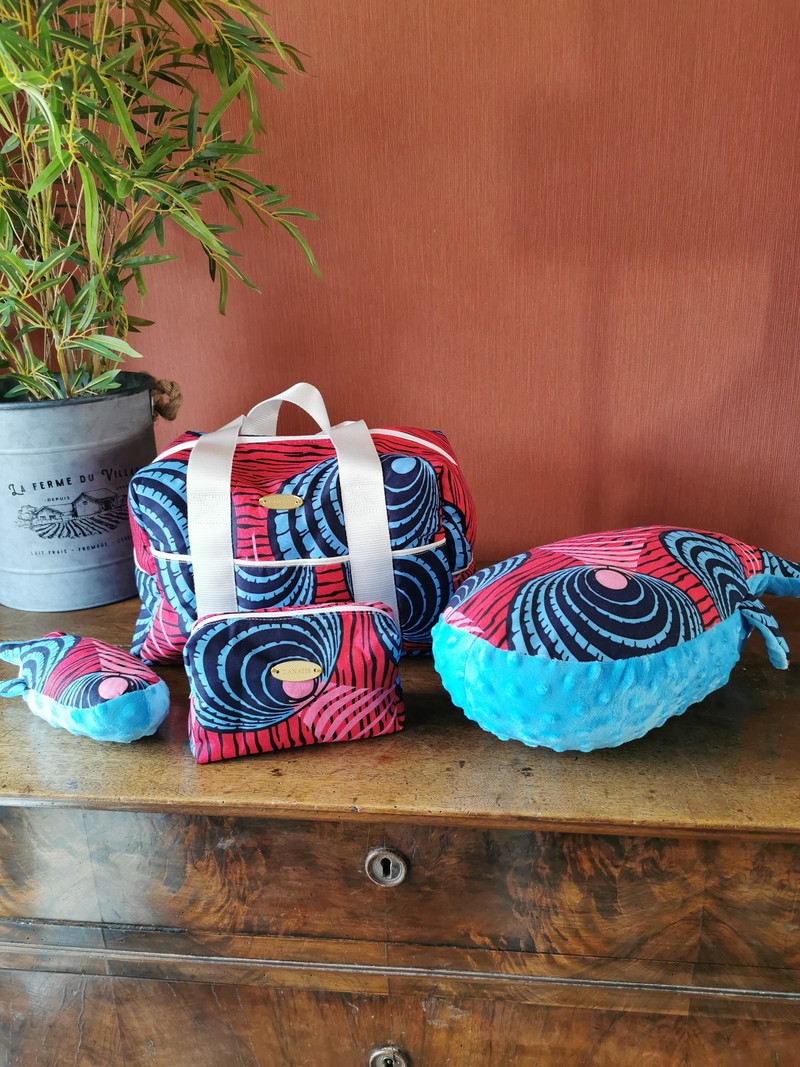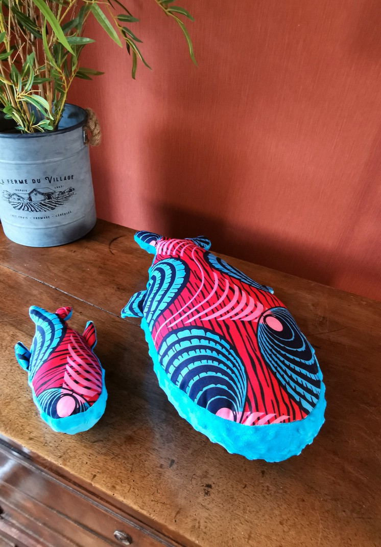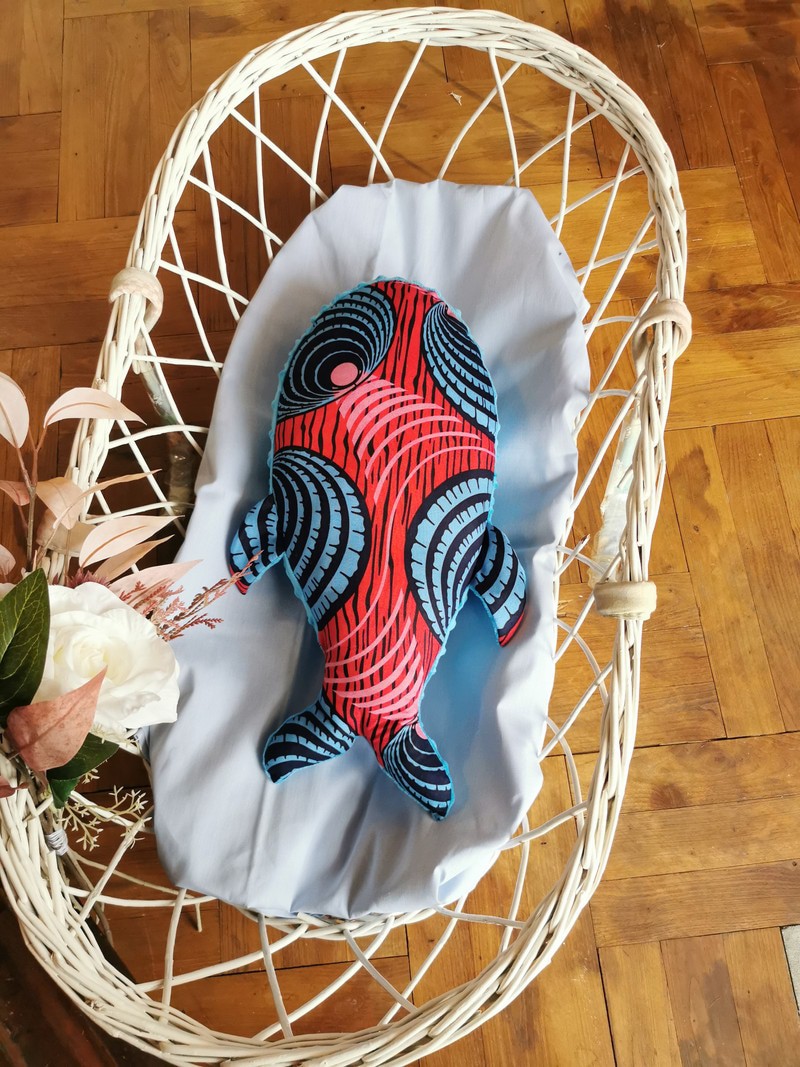 Notre baleine a été imaginée comme un vrai petit compagnon de tendresse pour les tout-petits. Cousue entièrement à la main, elle allie tissu wax coloré et matière ultra-douce minky, pour éveiller bébé au toucher, aux formes, et à sa culture.