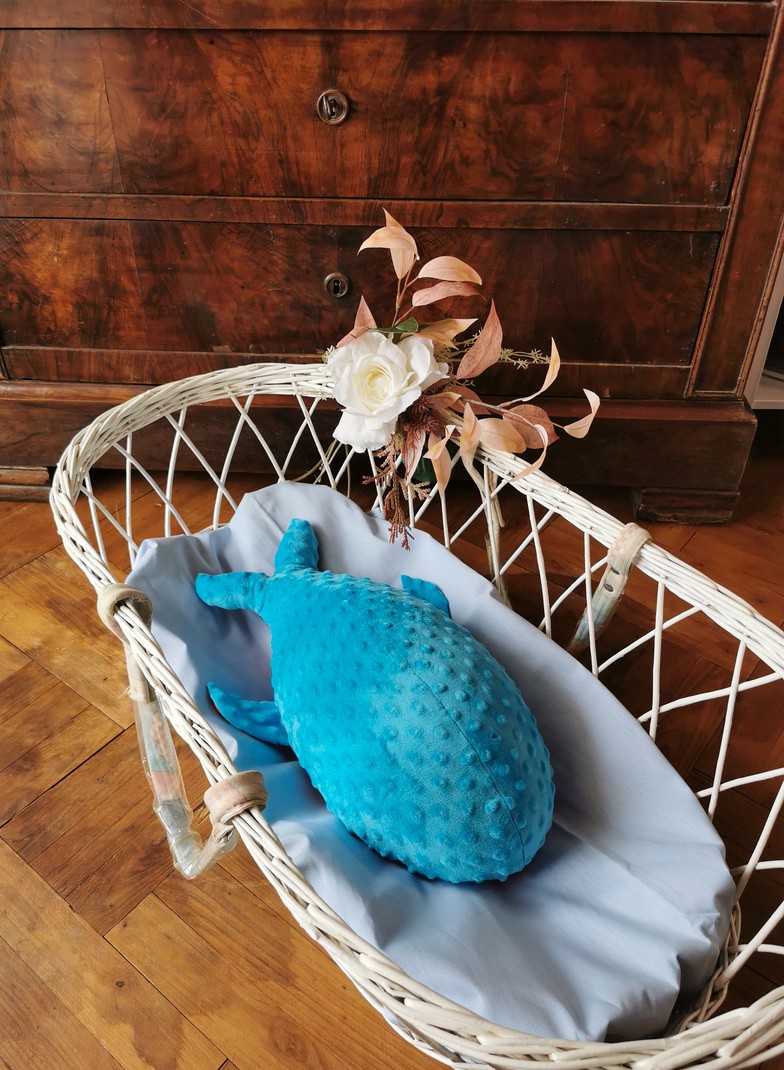 Il existe en deux tailles: une grande baleine pour conforter bébé à la maison et un petit baleineau à emporter dans son sac à langer pour le réconforter en balade hors de la maison.