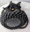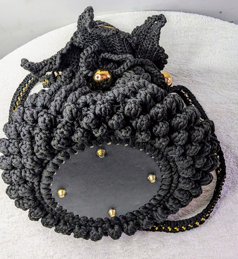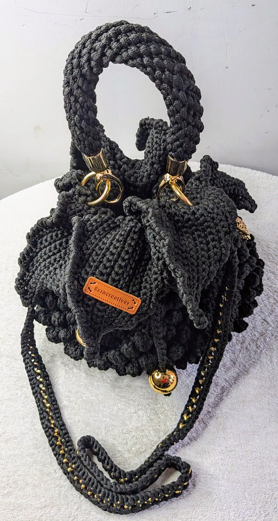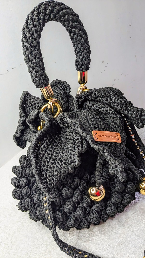 Elevate your accessory game with this stunning handmade black macramé handbag, crafted with love and precision. Featuring a rich, textured bobble design, this bag is perfect for adding a bold yet elegant touch to any outfit. The braided top handles and long adjustable strap offer versatile carrying options, while the shimmering gold hardware and accents—including decorative gold balls and rings—add a luxurious finish.