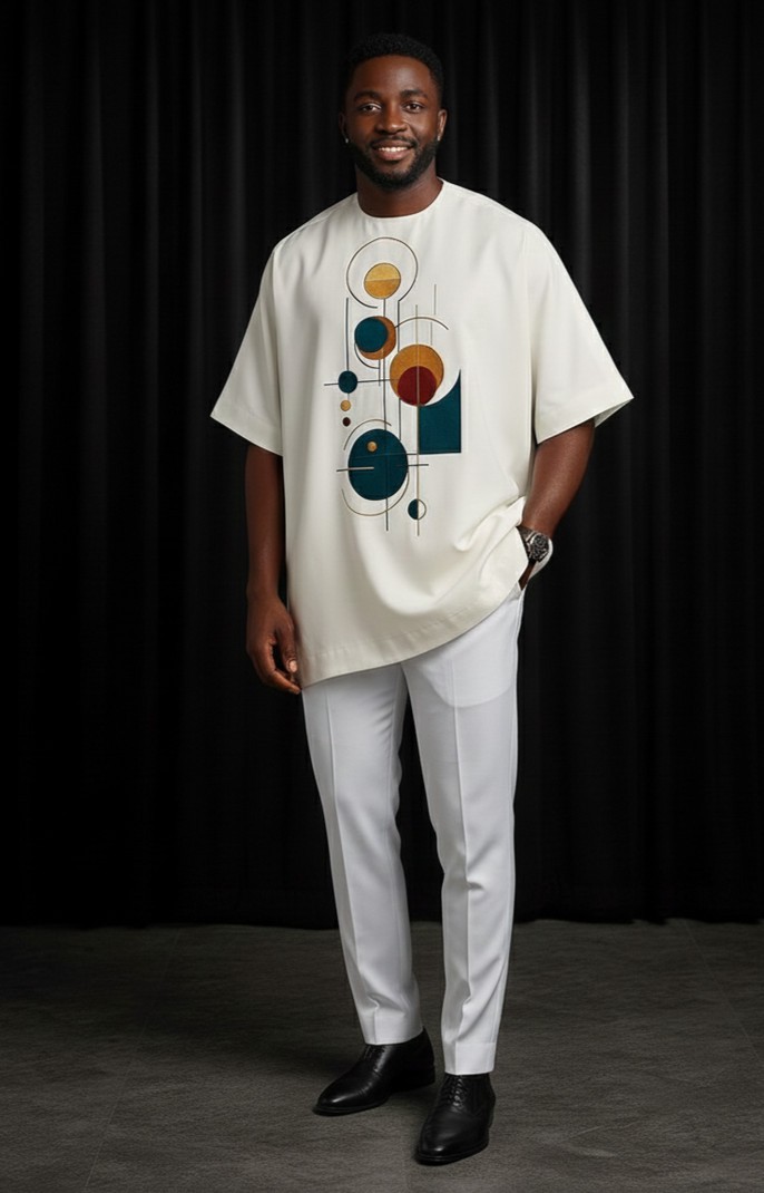 This set features a short-sleeved top and matching long trousers, both crafted from high-quality, comfortable fabric in a crisp Off-White/Cream hue. It's designed for the modern man who appreciates luxury, style, and comfort.