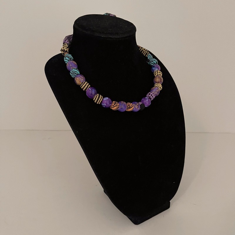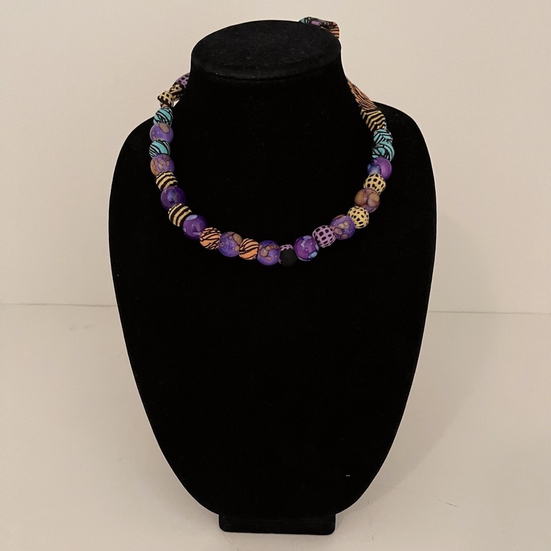 Green multicolor African print Ankara cotton beaded necklace Handmade