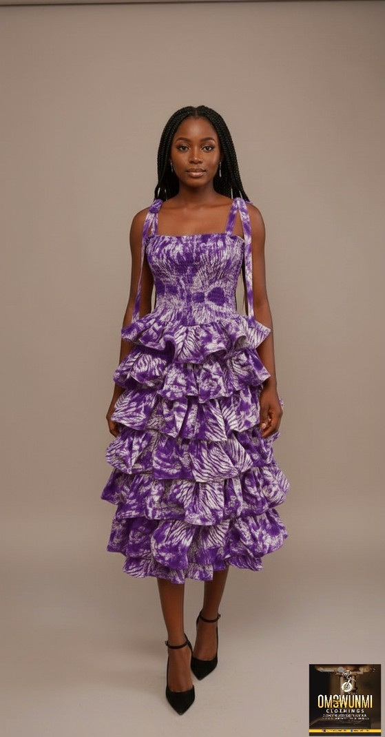 Make a statement in this stunning purple smocked gown designed with layers of cascading ruffles. The fitted bodice features adjustable shoulder ties for a comfortable fit, while the voluminous skirt adds playful movement and drama. Crafted from soft Kampala crepe fabric with a rich purple and white pattern, this dress is perfect for special occasions, photoshoots, or elegant dinners or weddings, or namings or casual events.