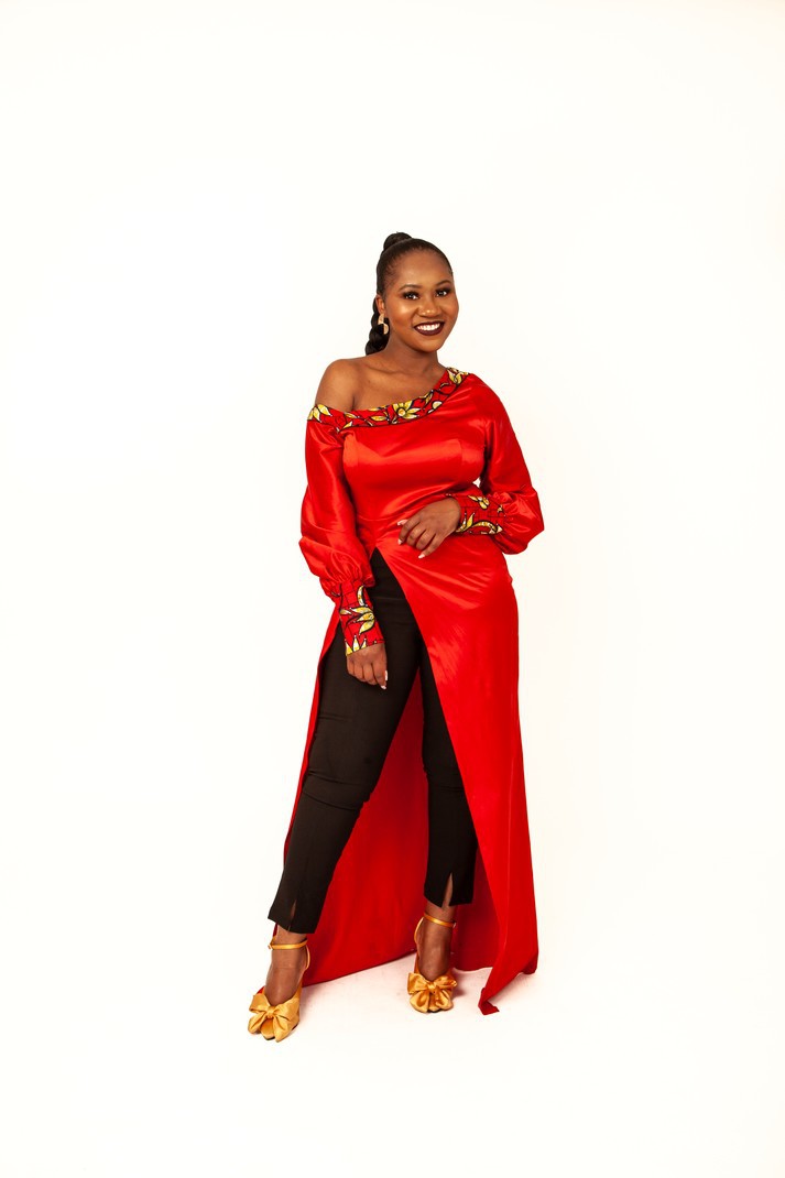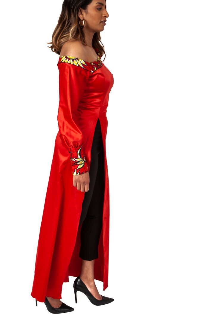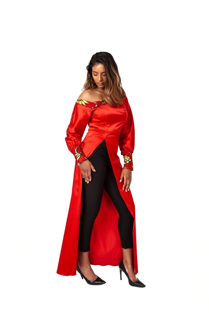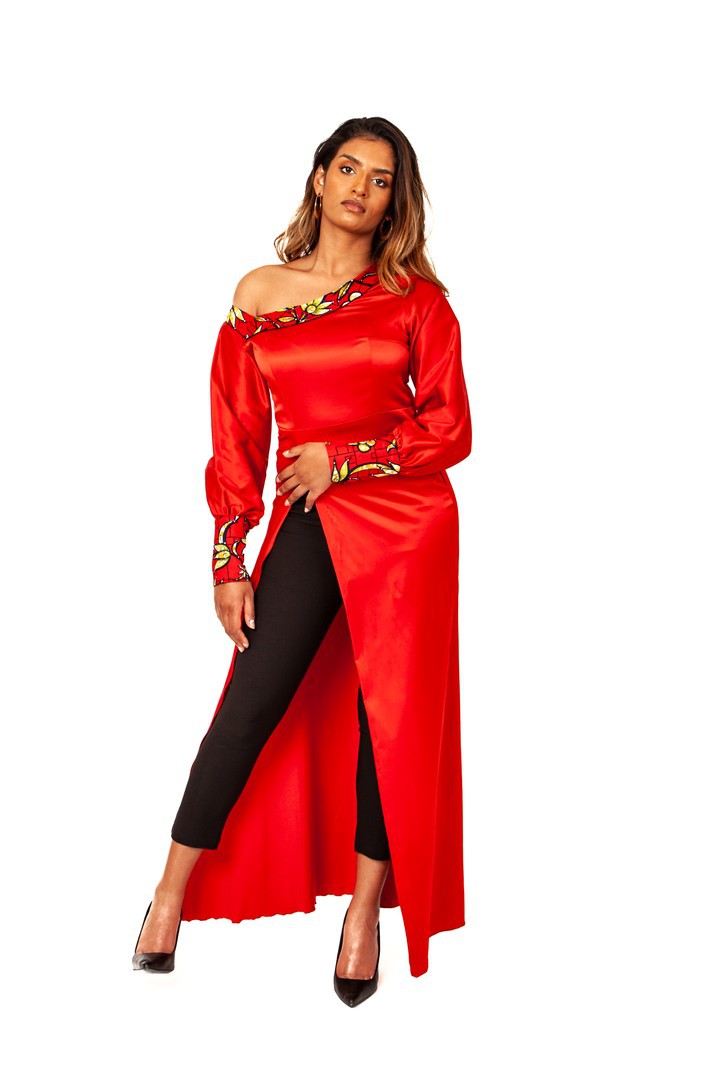 Asymmetrical long-sleeved top with maxi slit in cotton satin and 100% wax from the Vlisco brand. Suggestion: Can be worn with a skirt for a different look.
