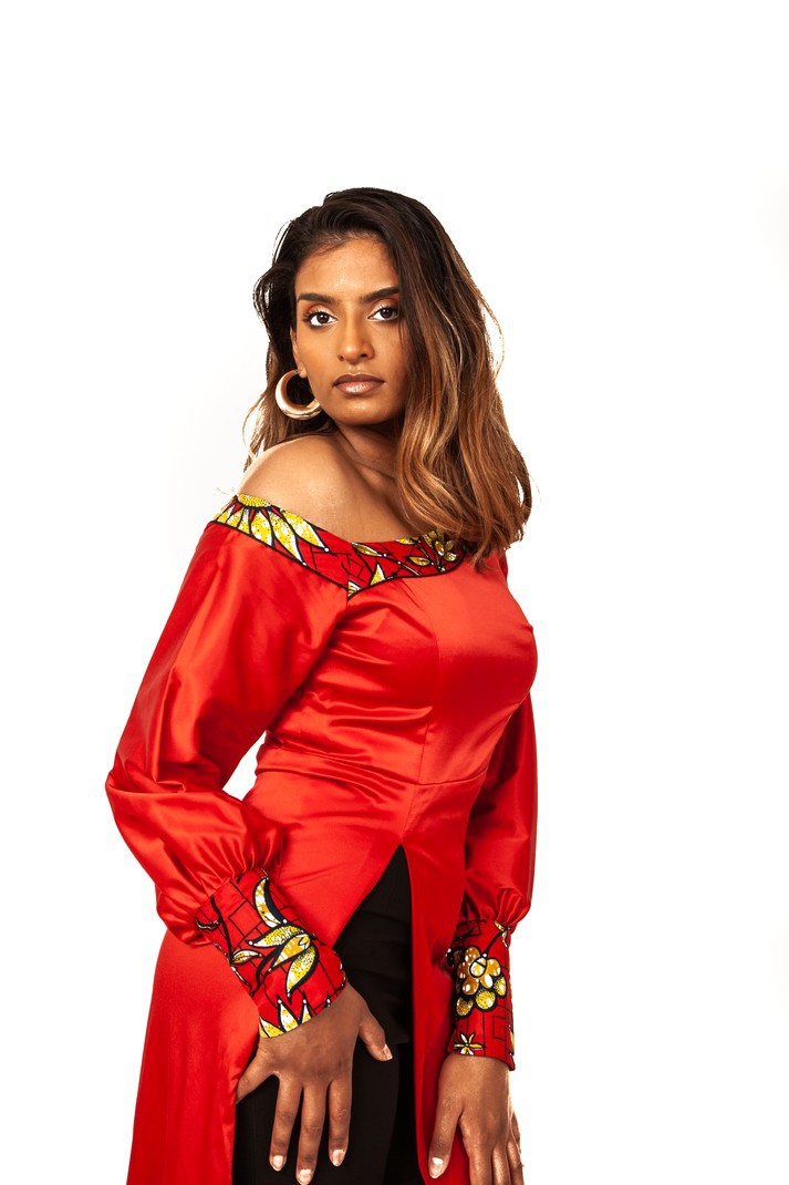 Haut manches longues asymétrique avec maxi fente en satin de coton et 100% wax de la marque Vlisco.
