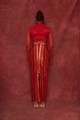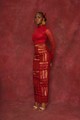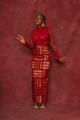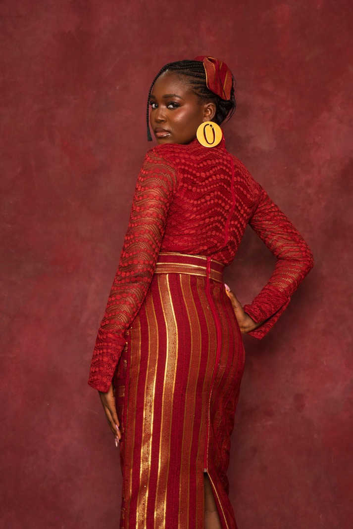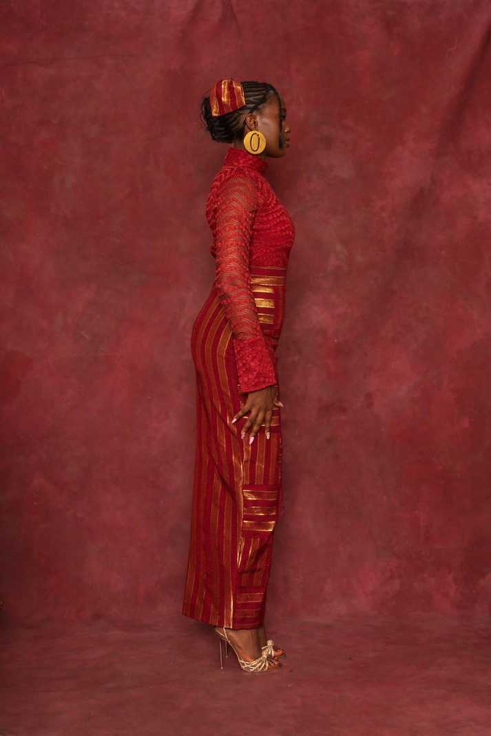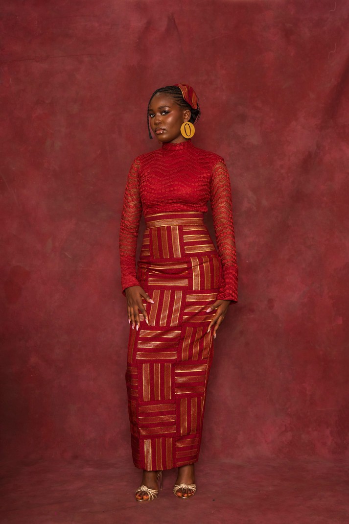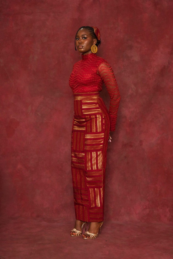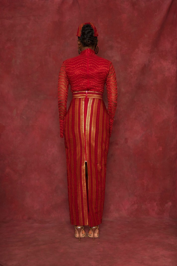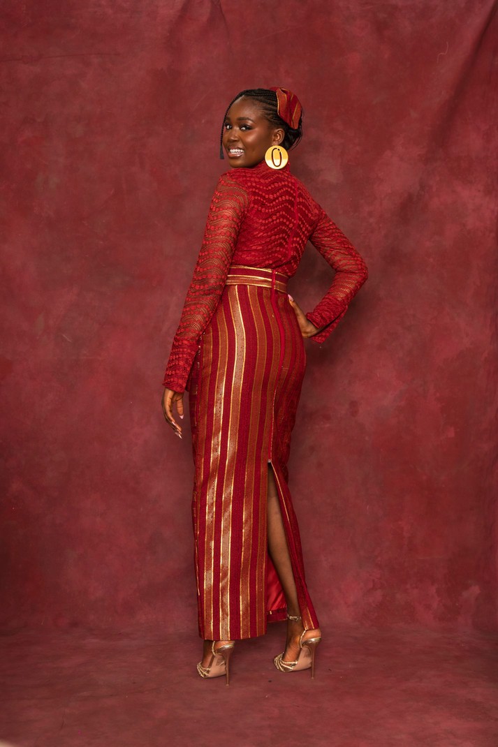 The Rhozubic Woven Maxi Skirt, it is named after our first bride, Chibuzor (Rhozubic spelt backwards) who wore the Skirt for her traditional wedding. The maxi skirt features a custom basket weave design and is tailored from a Red and Gold Pinstripe Aso-Oke fabric. It is paired with The Turtle Neck Blouse, made in a Wine detailed lace fabric.