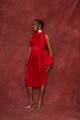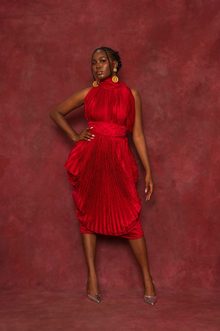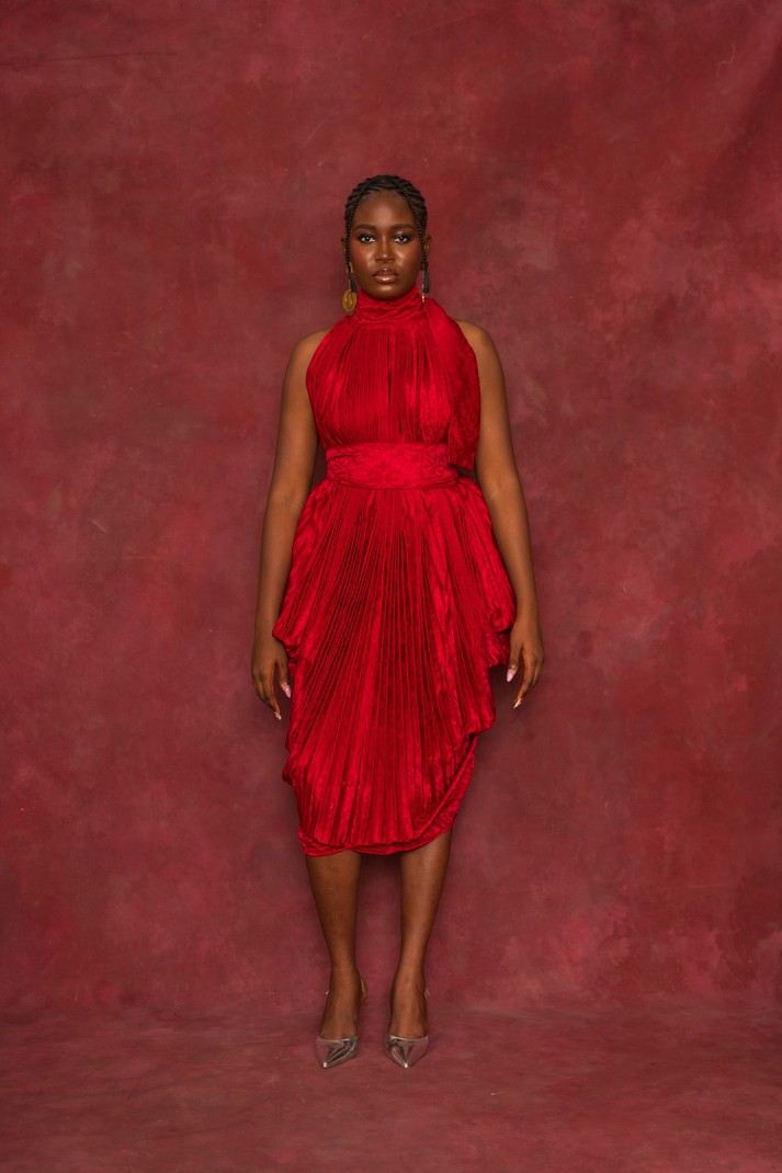 Pleated voluminous Dress made in a Red Silk Damask with a Pussybow neckline. Could be worn Front-ways/Back-ways or Styled with a belt to highlight a cinched waist.