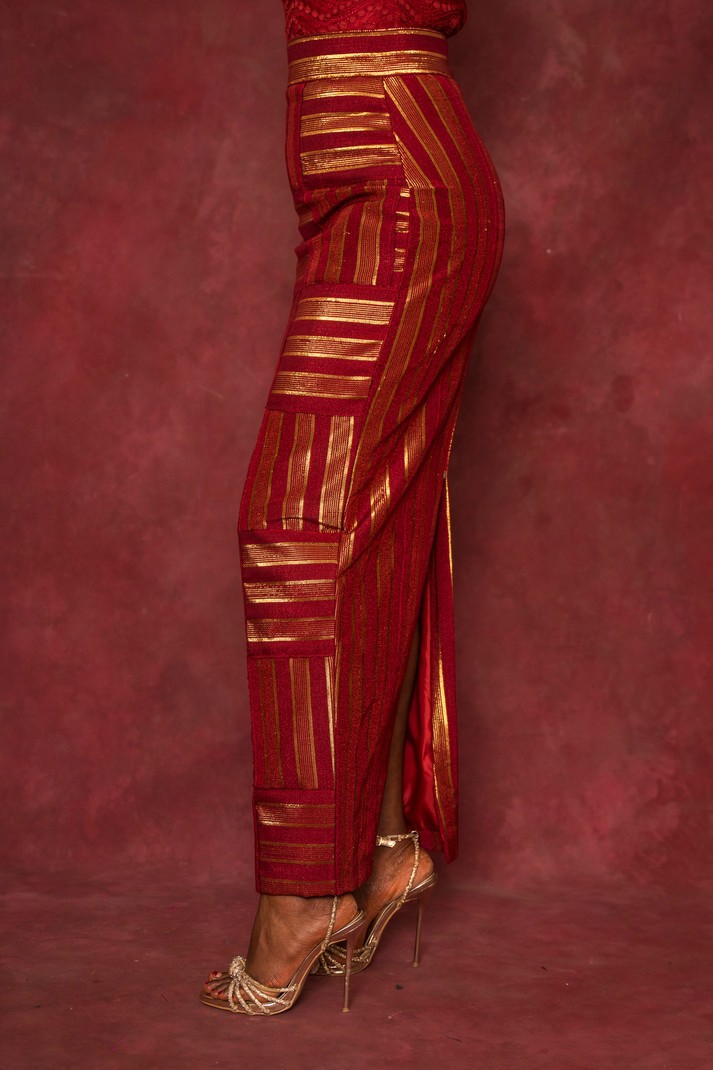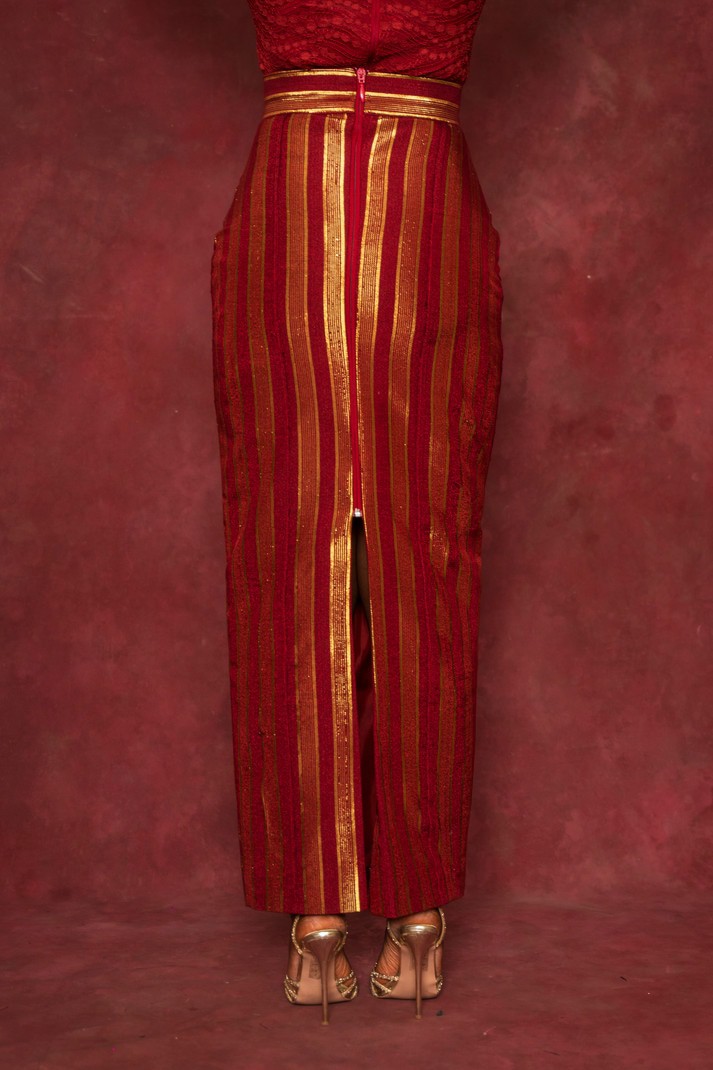 Introducing the Rhozubic Woven Maxi Skirt, it is named after our first bride, Chibuzor (Rhozubic spelt backwards) who wore the Skirt for her traditional wedding. It is a maxi skirt which features a custom basket weave design and is tailored from a Red and Gold Pinstripe Aso-Oke fabric.