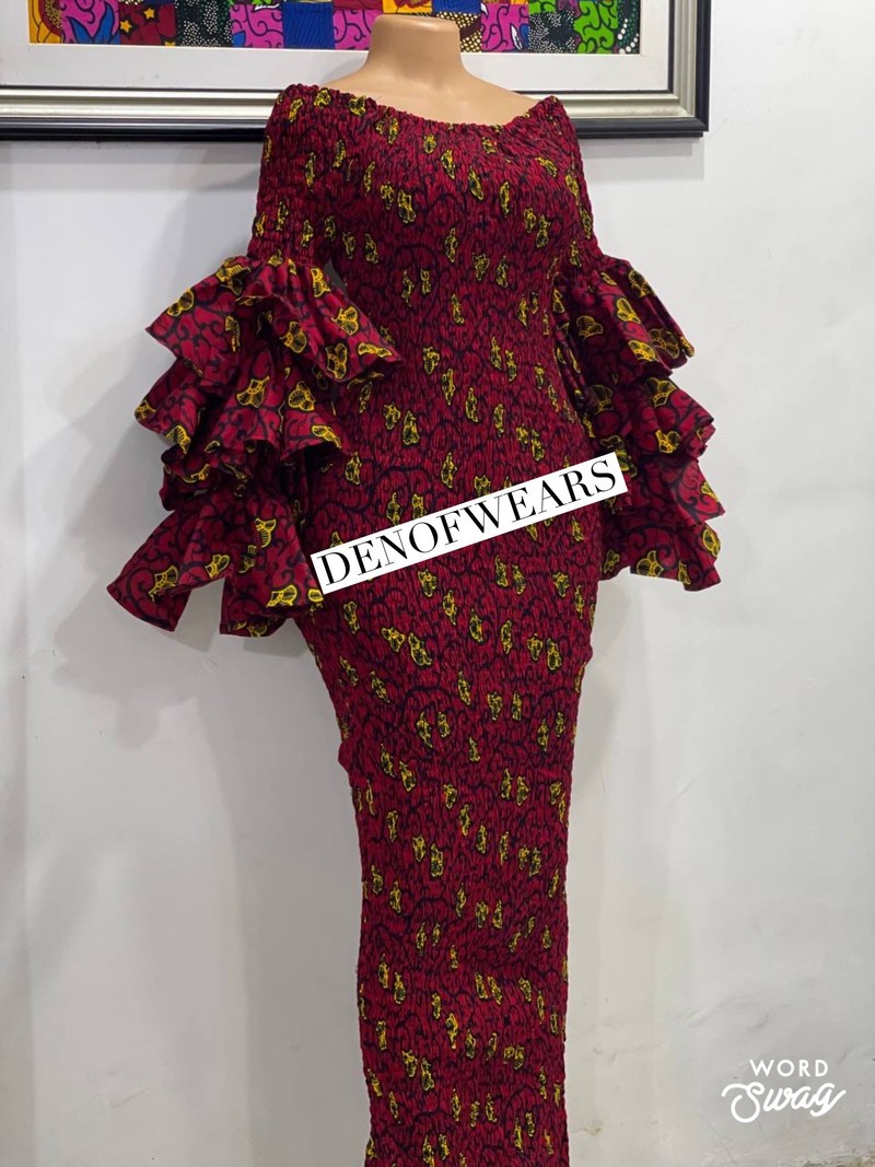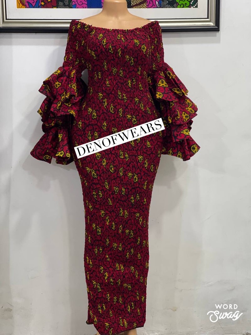 Red smocked long Ankara dress. Bodycon African print dress.Ankara dress with layered sleeves