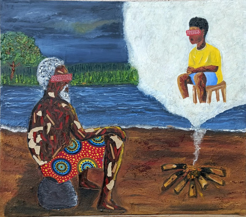 Beside him, a gently burning fire crackles—its smoke rising into the twilight sky, forming a tapestry of memories that dance with echoes of his youth. The soothing sounds of crickets, the playful movement of fish in the river, and the soft murmur of his voice creates a harmonious symphony of nostalgia and serenity.