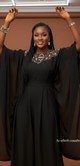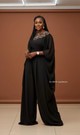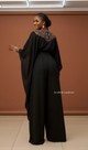 Design & Fabric: Crafted from a beautiful, flowing black crepe (or chiffon/georgette—insert actual fabric type here), the wide, dramatic sleeves and broad palazzo-style legs create a stunning silhouette that moves beautifully with you. The neckline features an intricate geometric appliqué in rich, complementary tones, adding a luxurious touch of detail without the need for a necklace.