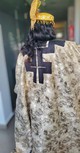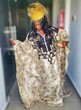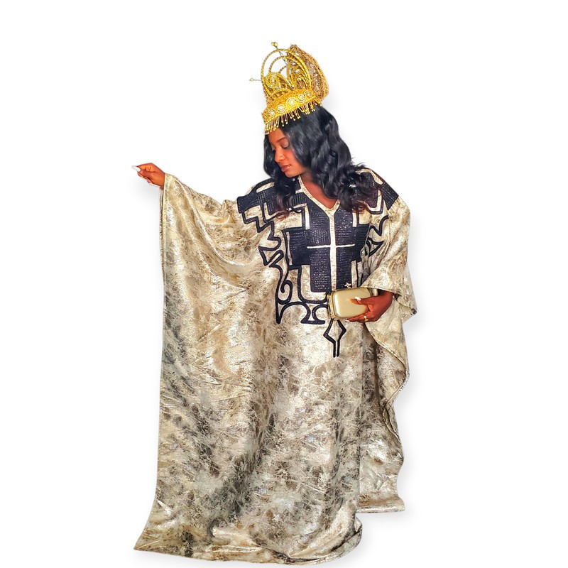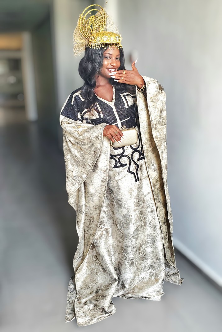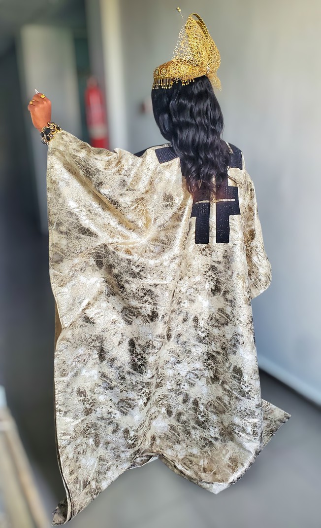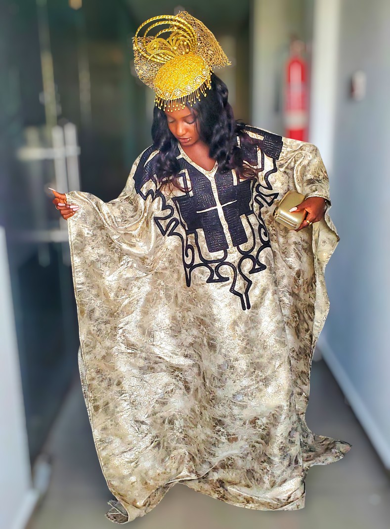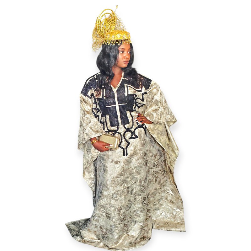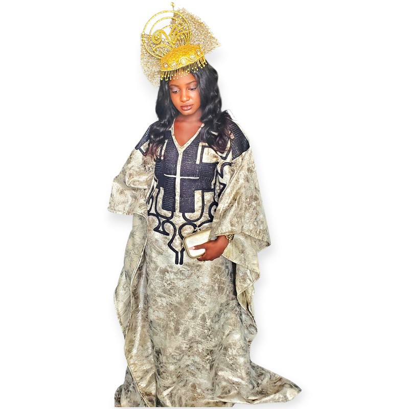 Delicately handmade from a rare luxury brocade damask fabric, this piece is designed as a V-neck tie-in belt boubou dress. It is hand embroidered both in front and at the back with the finest threads to give it added glamour and sophistication.